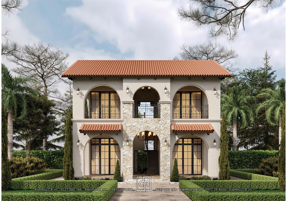 Mẫu biệt thự 2 tầng mang phong cách Địa Trung Hải gây ấn tượng mạnh với vẻ đẹp thanh lịch, nhẹ nhàng nhưng không kém phần sang trọng. Thiết kế phù hợp với những gia chủ yêu thích không gian sống gần gũi thiên nhiên, tối ưu công năng trên diện tích xây dựng khoảng 75m².