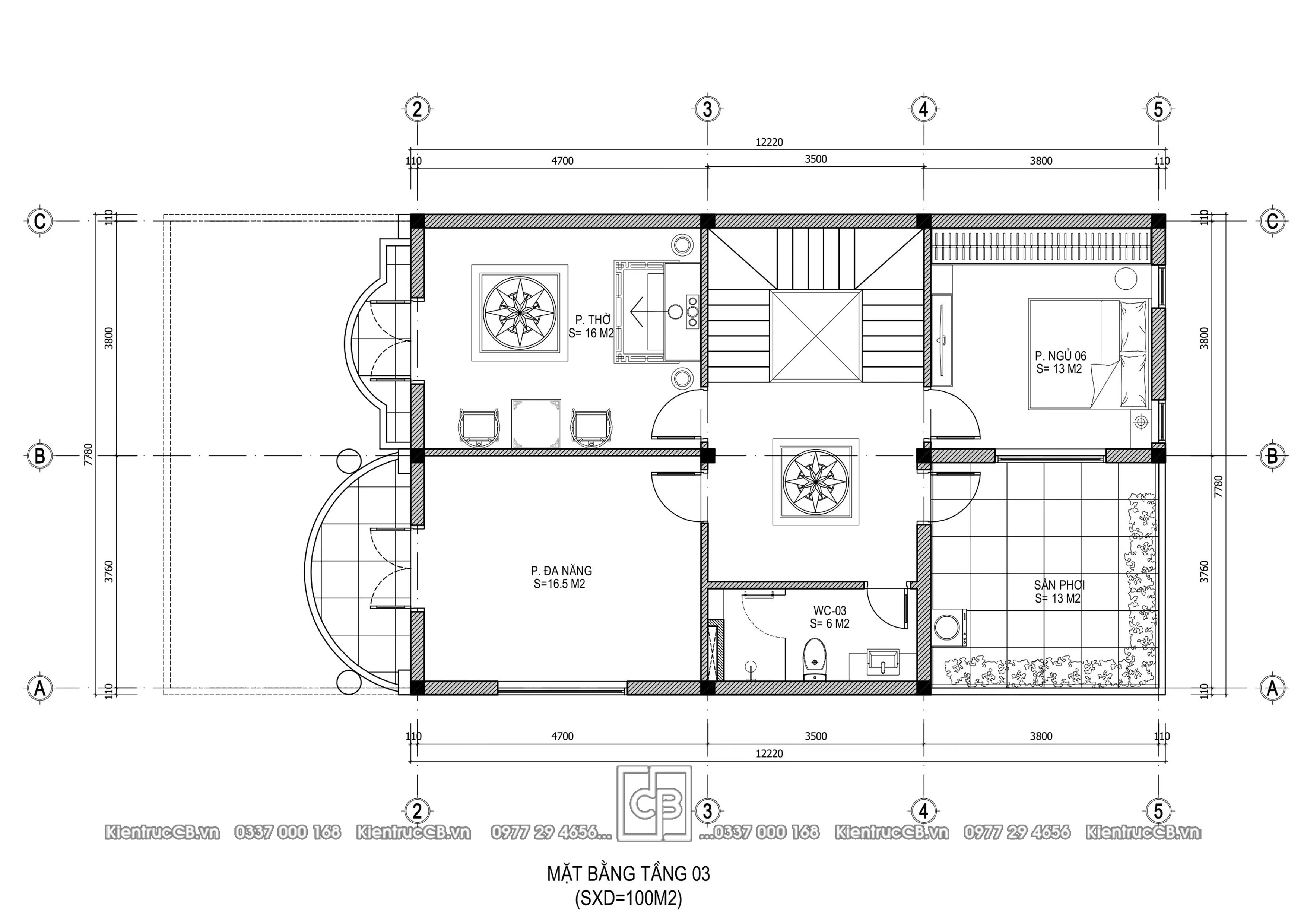 - Phòng thờ (~16m²): đặt vị trí trang trọng, yên tĩnh