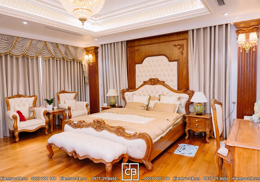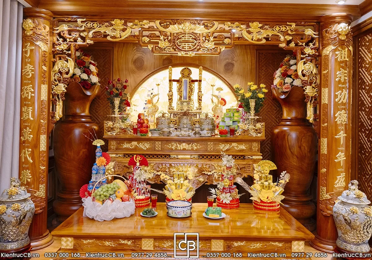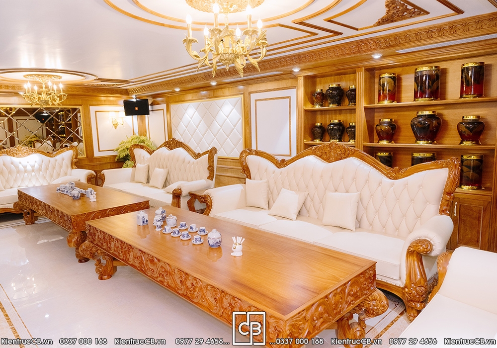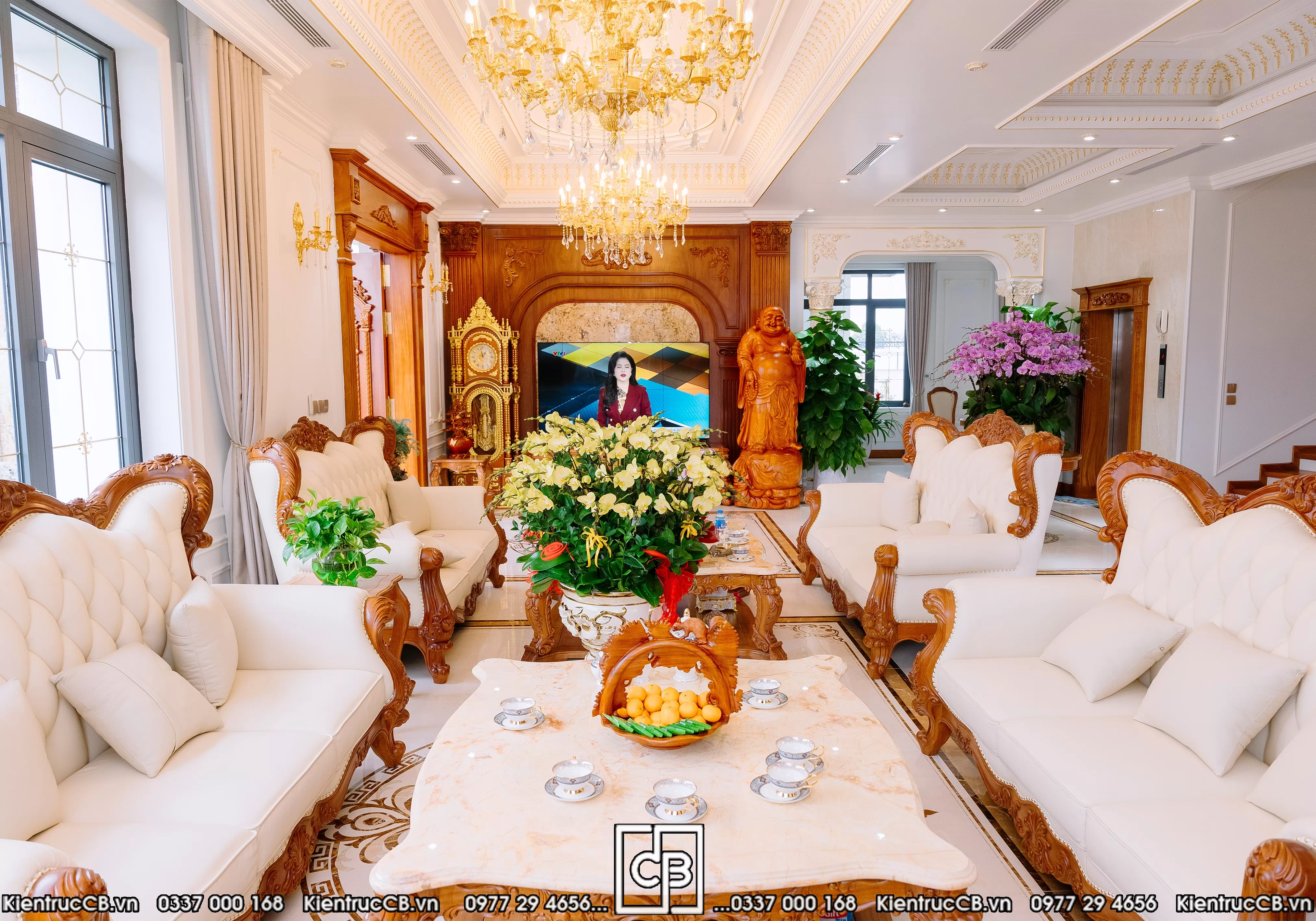 Không gian nội thất nổi bật với chất liệu gỗ tự nhiên, đường nét chạm khắc tinh xảo và bố cục cân đối. Từ phòng khách, phòng thờ, phòng sinh hoạt đến phòng ngủ, mỗi không gian đều được thi công tỉ mỉ, đảm bảo cả tính thẩm mỹ lẫn công năng sử dụng. Hệ trần, đèn trang trí và ánh sáng được tính toán kỹ, giúp tôn lên vẻ sang trọng và ấm cúng cho toàn bộ ngôi nhà.