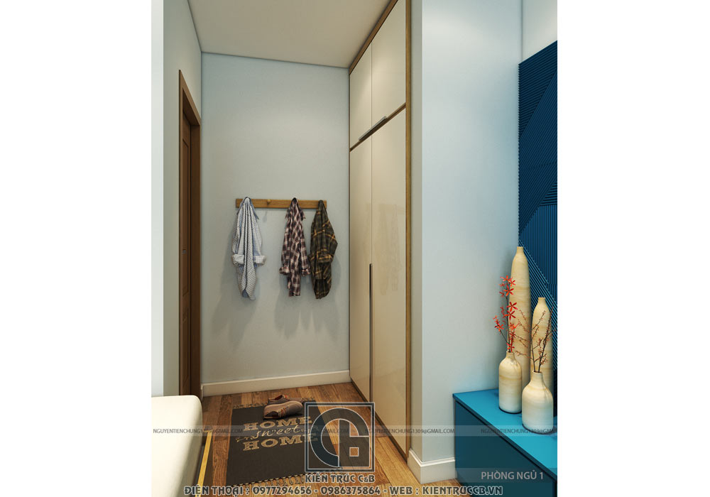 Nếu như phòng khách, phòng ngủ Master và phòng ngủ con 01 sử dụng tone màu xanh da trời với các mức độ khác nhau làm điểm nhấn thì trong căn phòng nhỏ này, kiến trúc sư đã sử dụng màu vàng chanh thật ấn tượng và bắt mắt cho mảng tường đầu giường.