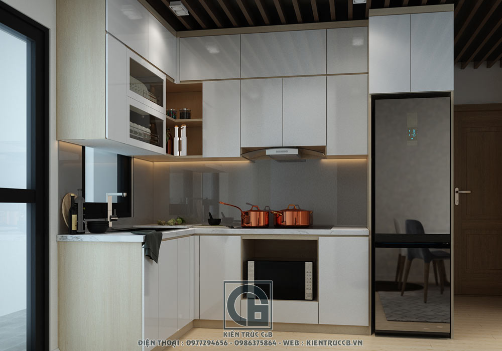 Nội thất phòng bếp được thiết kế với đầy đủ tiện nghi, sang trọng, đẳng cấp. Khu bếp và bàn ăn nối liền nhau rất tiện lợi. Khu ban thờ cũng được đặt gần bếp và làm vách ngăn gỗ rất trang trọng, có tính thẩm mỹ cao. Ngoài phòng khách thì phòng bếp trong các căn hộ chung cư hoặc biệt thự cũng là khu vực được nhiều chủ đầu tư để ý tới. Bạn có thể tham khảo thêm các mẫu thiết kế cho phòng bếp Tại đây.