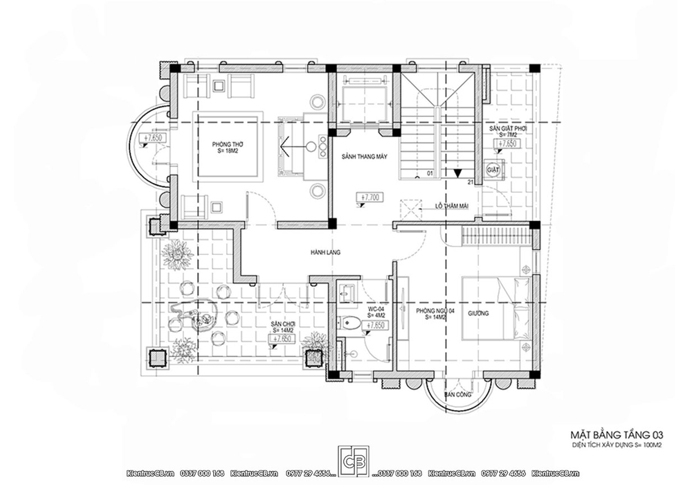 - Phòng ngủ 3 (~14m²): Tối ưu diện tích nhưng vẫn đảm bảo thông thoáng.