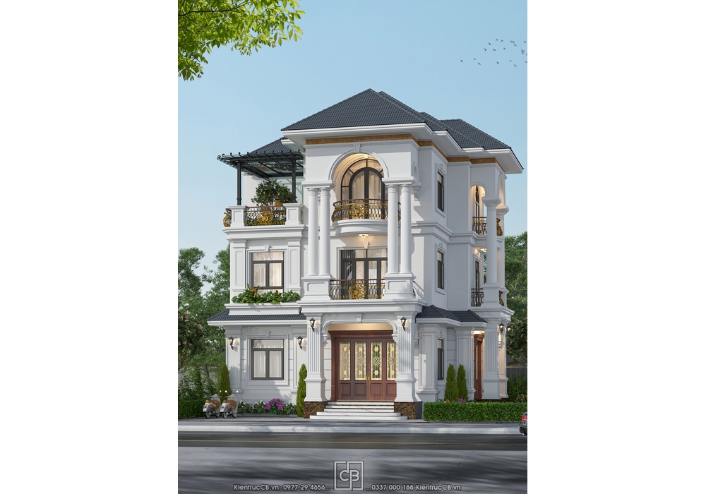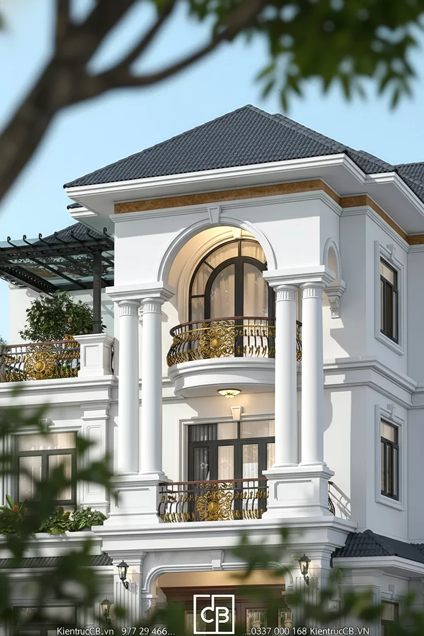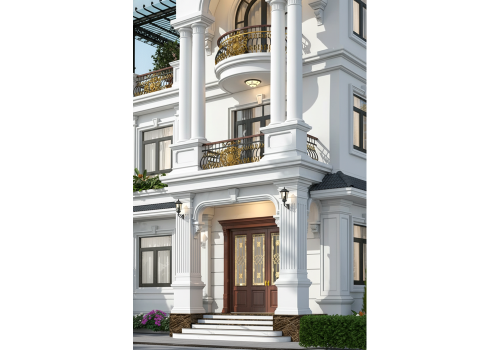 Mẫu biệt thự tân cổ điển 3 tầng mái Nhật là sự giao thoa hoàn hảo giữa vẻ đẹp cổ điển sang trọng và tinh thần sống hiện đại. Tông trắng chủ đạo kết hợp hệ cột lớn đăng đối, ban công sắt mỹ thuật uốn lượn tạo nên một tổng thể vừa bề thế vừa thanh lịch.