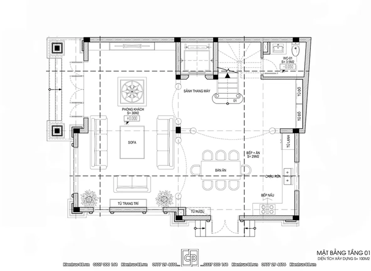 - Phòng khách (~36m²): Nằm ngay trung tâm, rộng rãi, sang trọng – là nơi tiếp khách và thể hiện gu thẩm mỹ của gia chủ.