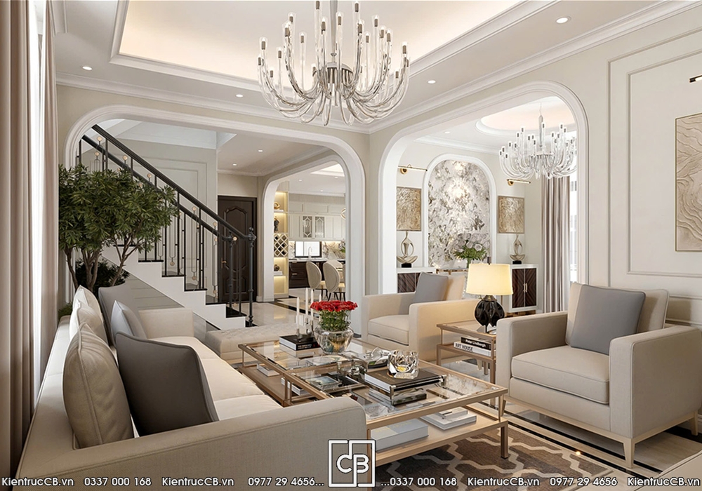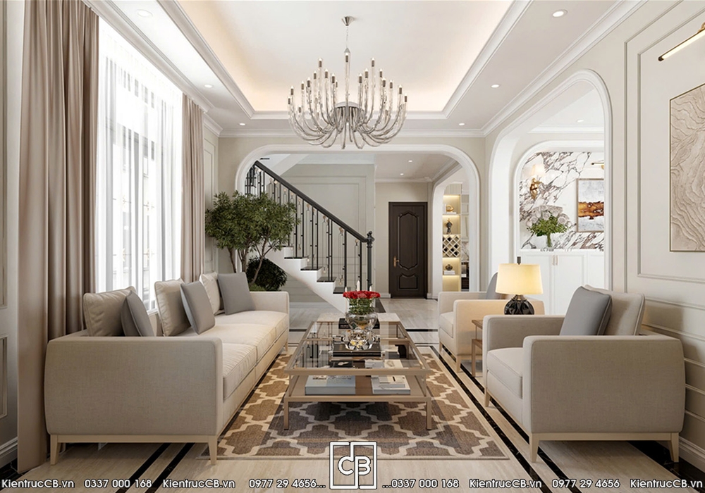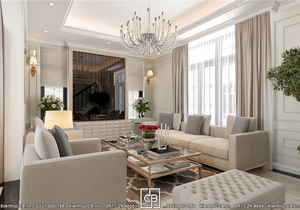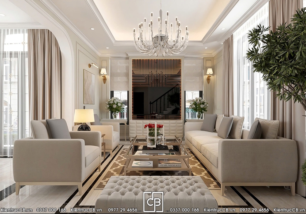 Phòng khách được xem là không gian thể hiện rõ nhất gu thẩm mỹ của gia chủ. C&B lựa chọn bố cục đối xứng đặc trưng của phong cách tân cổ điển, kết hợp nội thất bọc nỉ cao cấp gam màu trung tính nhằm tạo cảm giác ấm áp và dễ chịu.