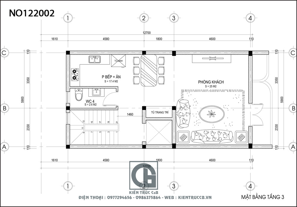 Tầng 3 được sử dụng làm phòng khách với diện tích 25m2 và phòng bếp + ăn với diện tích 17,4m, WC chung có diện tích khoảng gần 3m. Ở khu vực gần thang máy còn được thiết kế khu vực làm tủ trang trí khá gọn gàng và đẹp mắt.