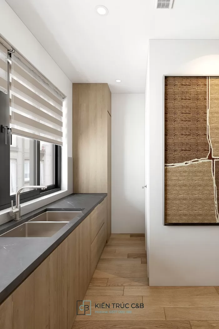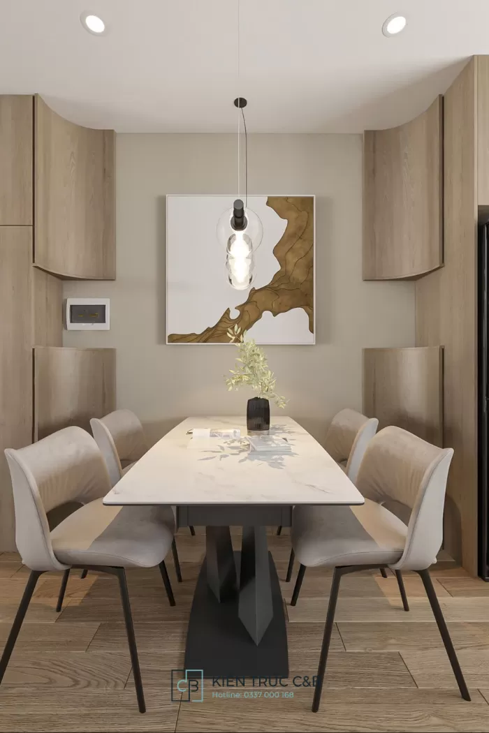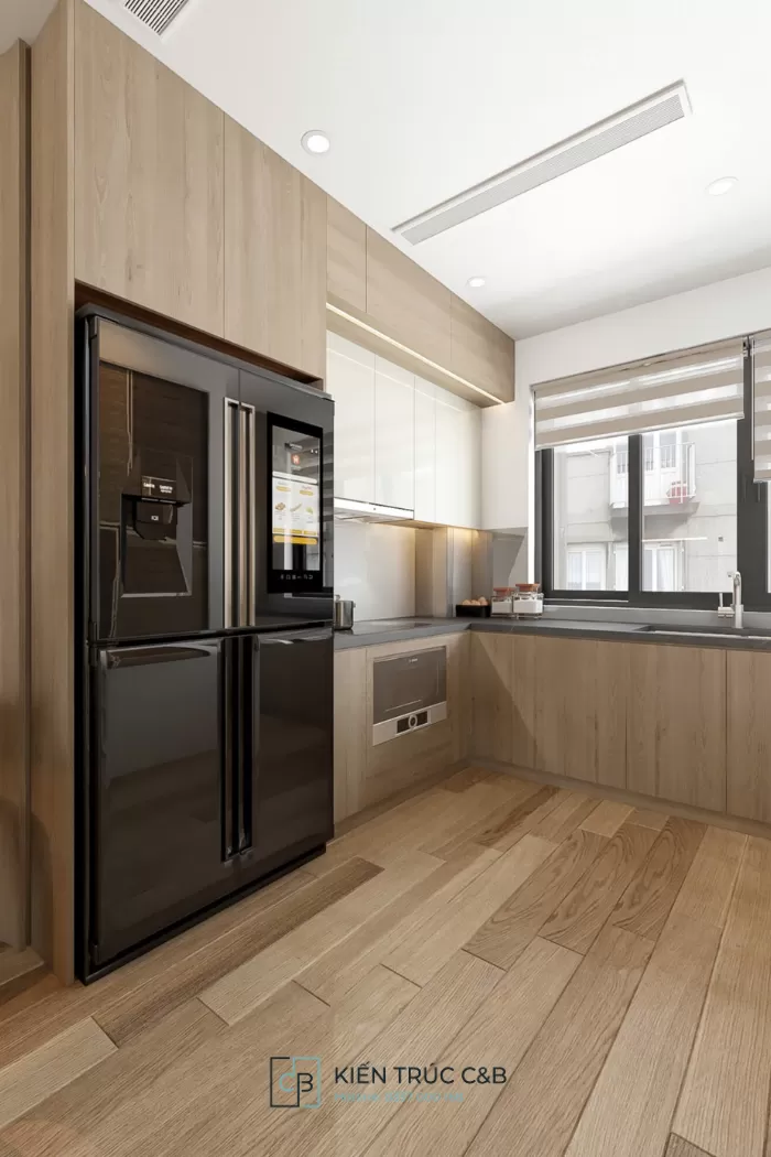 Khu bếp: Thiết kế theo phong cách hiện đại nhưng tinh tế, sử dụng hệ tủ bếp thông minh giúp tối ưu không gian, kết hợp bàn đảo tạo điểm nhấn và tăng công năng sử dụng.