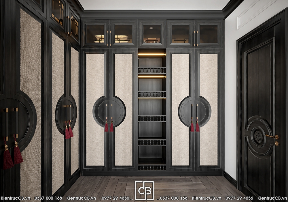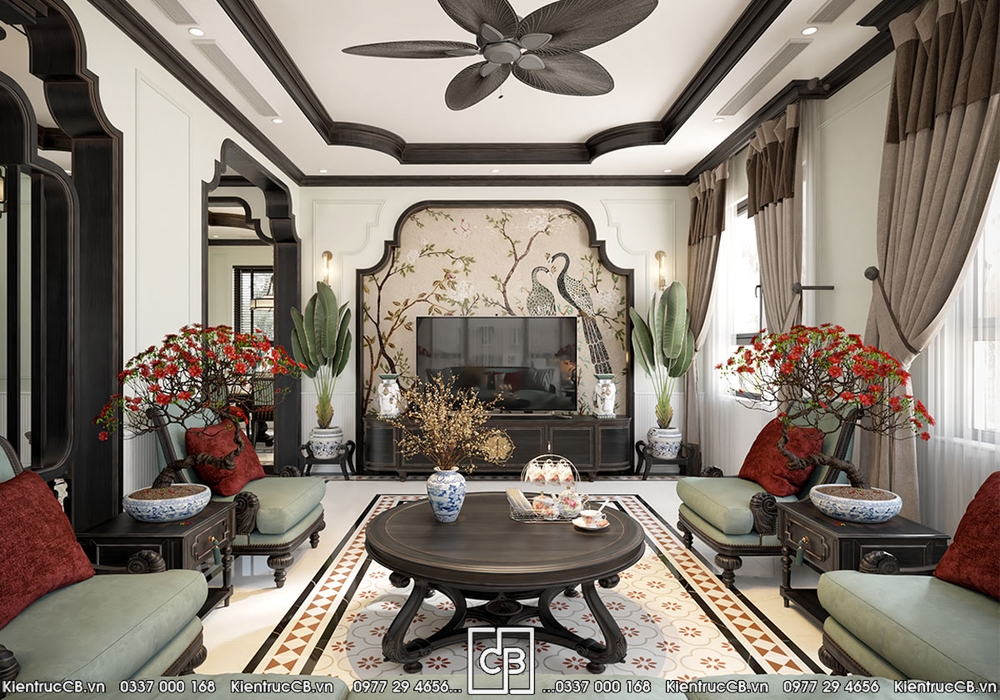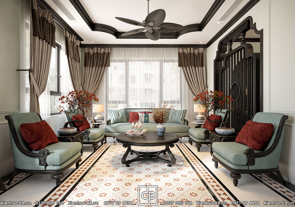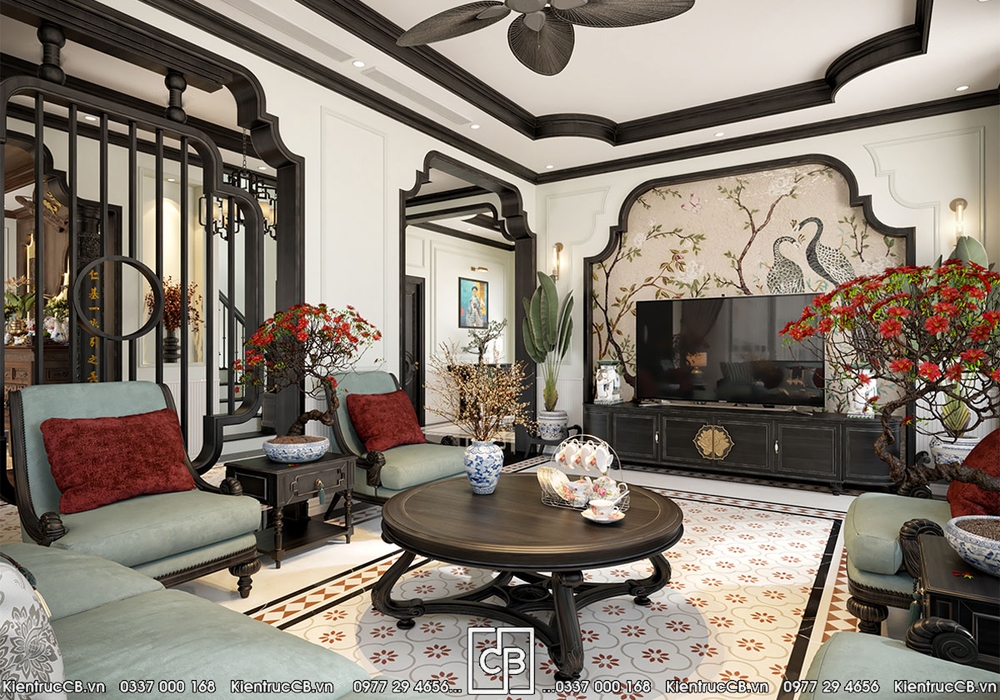 Nội thất chủ đạo là sofa gỗ tự nhiên, đệm bọc vải linen hoặc nỉ trầm màu, kết hợp bàn trà tròn thấp mang tinh thần Á Đông. Hệ vách trang trí, khung cửa, trần phào chỉ được xử lý mềm mại bằng những đường cong đặc trưng của kiến trúc Đông Dương, vừa cổ điển vừa gần gũi.