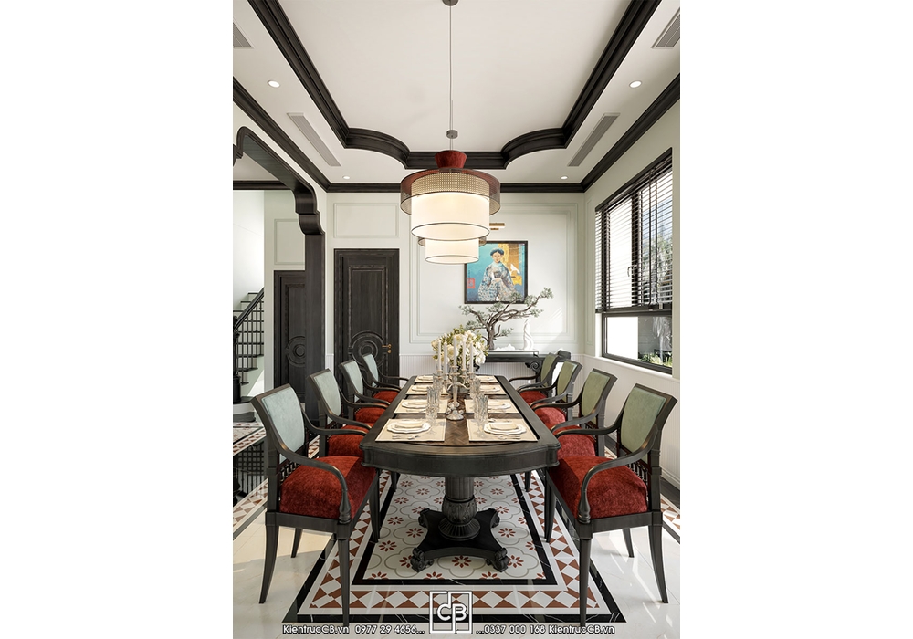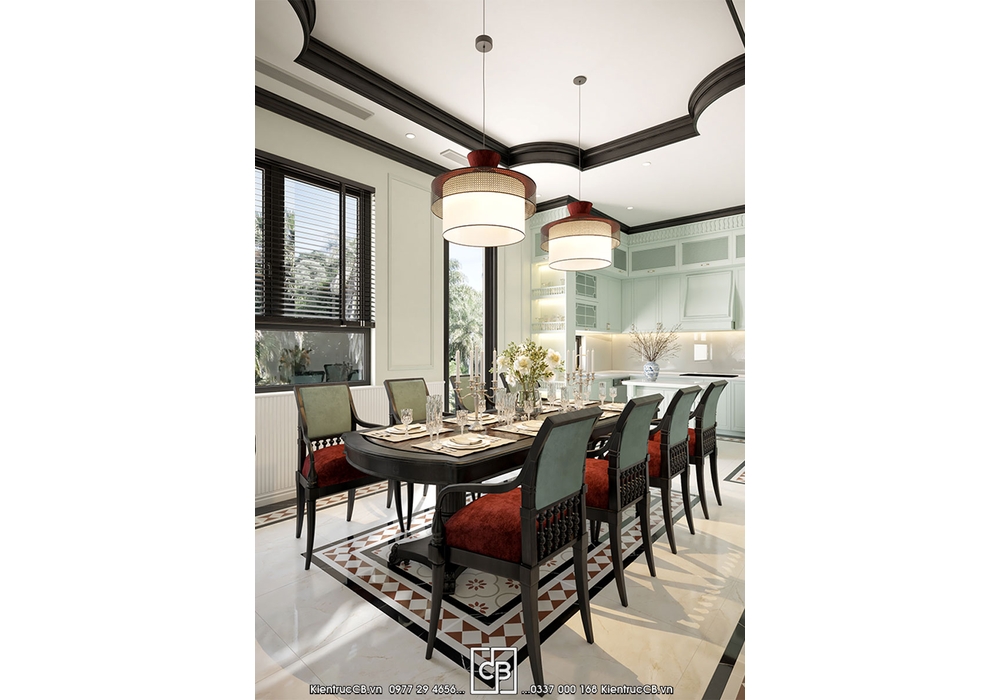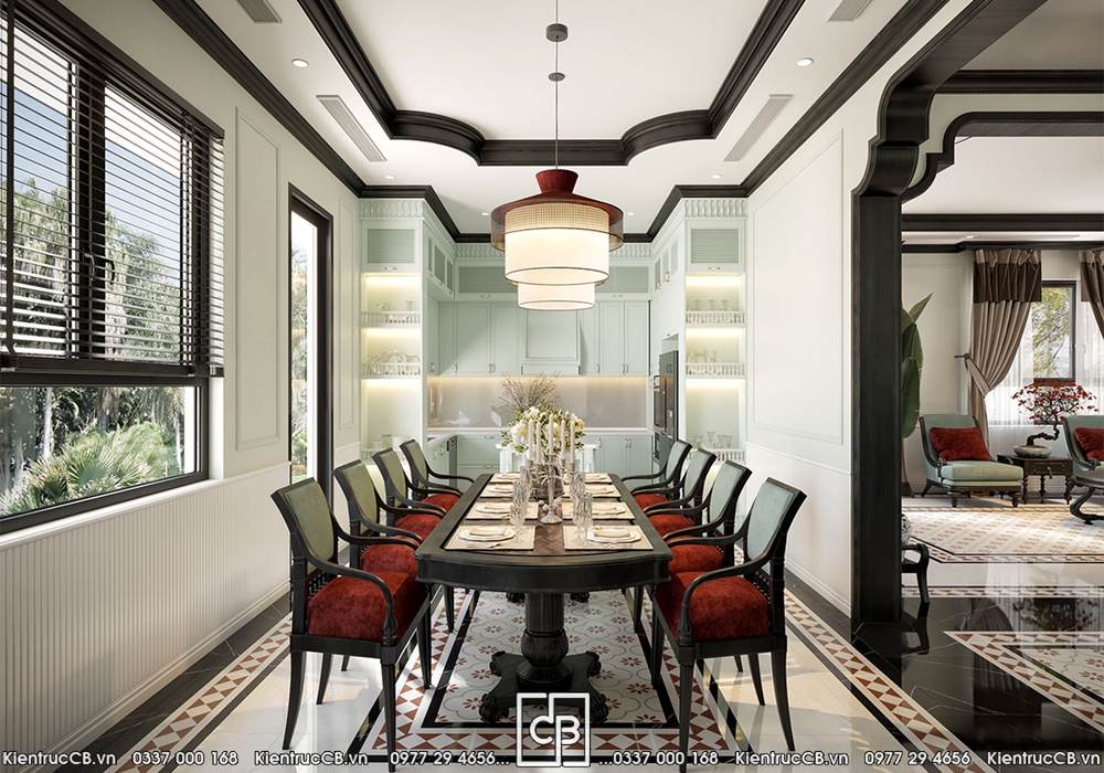 Đèn thả trần là điểm nhấn quan trọng, ánh sáng vàng dịu giúp bữa ăn thêm ấm áp và mang tính nghi lễ. Sàn thường sử dụng gạch bông hoa văn cổ điển hoặc đá tự nhiên kết hợp viền họa tiết, tạo dấu ấn rất riêng của phong cách Đông Dương.