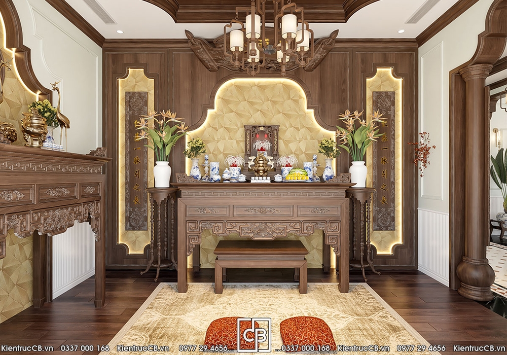 Bàn thờ gia tiên thường được làm từ gỗ tự nhiên chạm khắc tinh xảo, hoa văn truyền thống Á Đông, kết hợp nền ốp hoặc vách trang trí màu vàng nhạt, ánh kim nhẹ tạo chiều sâu và sự linh thiêng. Ánh sáng trong phòng thờ được xử lý tinh tế, sử dụng đèn hắt gián tiếp, ánh sáng vàng ấm, tránh chiếu trực diện gây chói.
