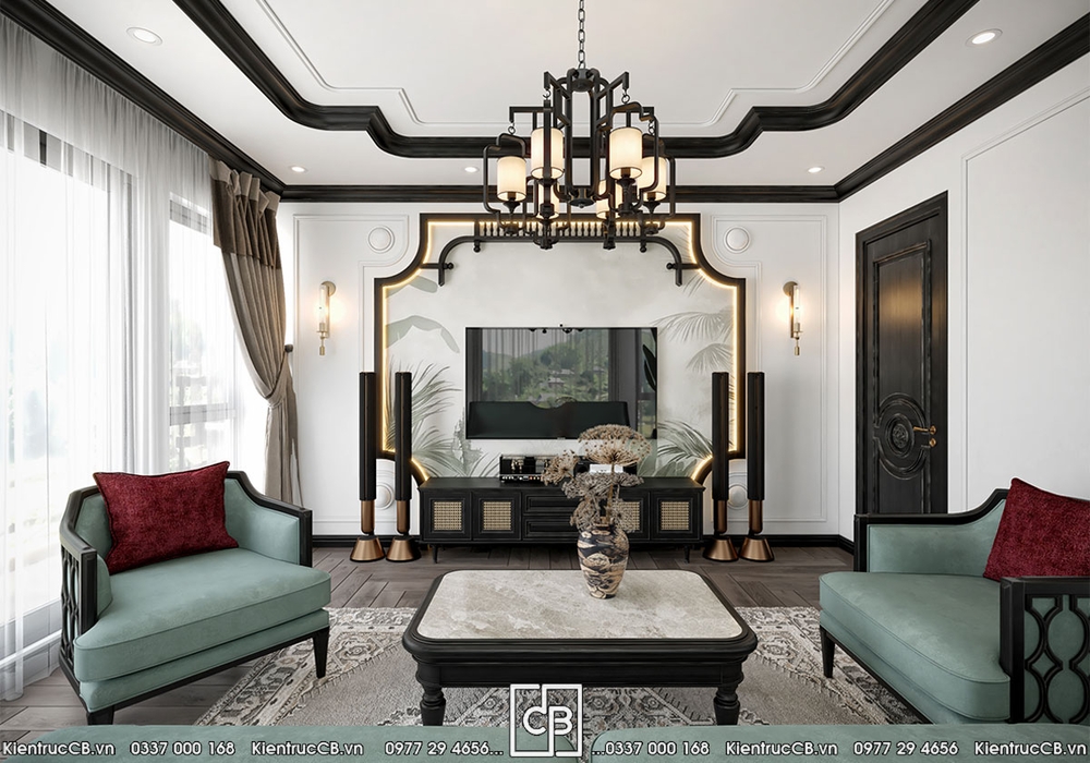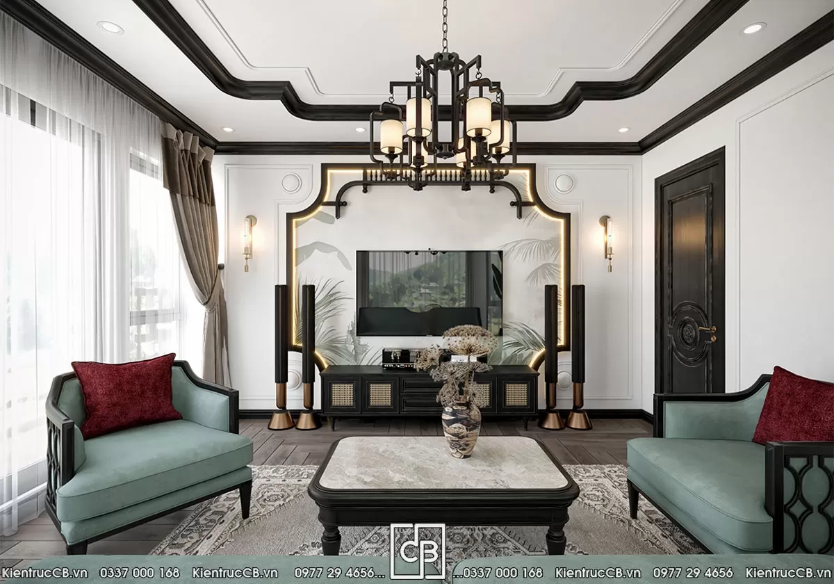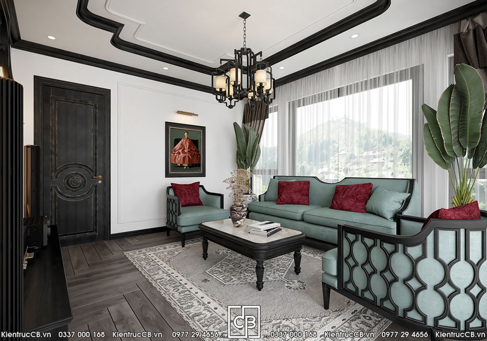 Bảng màu đặc trưng: Sự phối hợp hoàn hảo giữa tông trắng chủ đạo, điểm xuyết các đường phào chỉ đen nổi bật trên trần và tường. Sắc xanh ngọc của ghế sofa kết hợp cùng gối tựa màu đỏ nhung tạo nên điểm nhấn thị giác mạnh mẽ.
