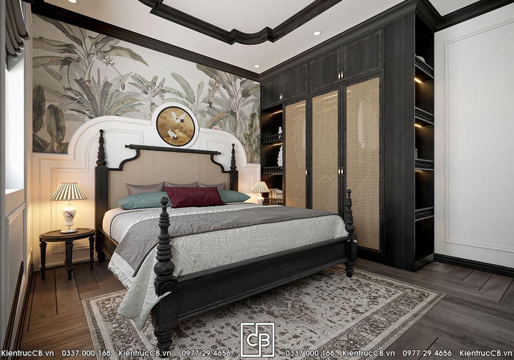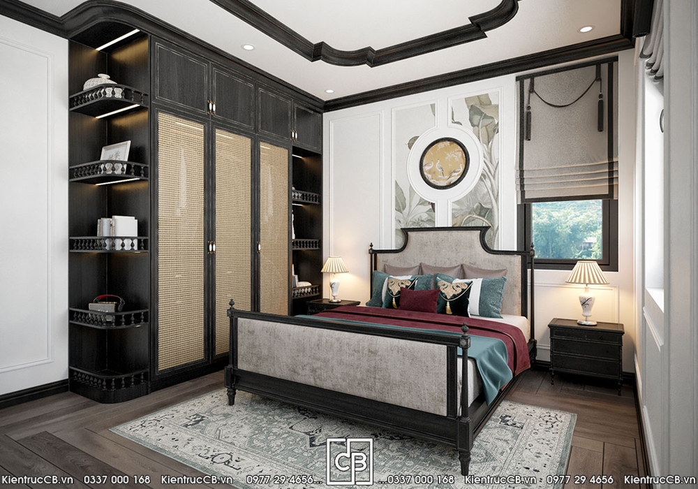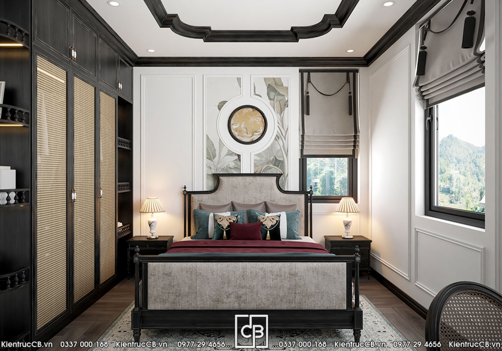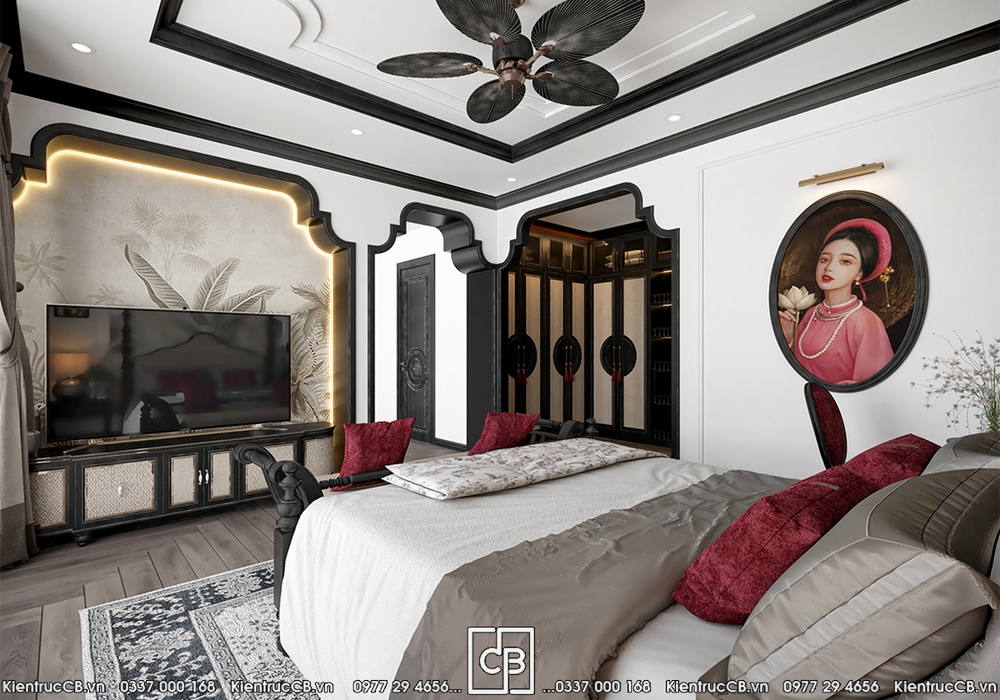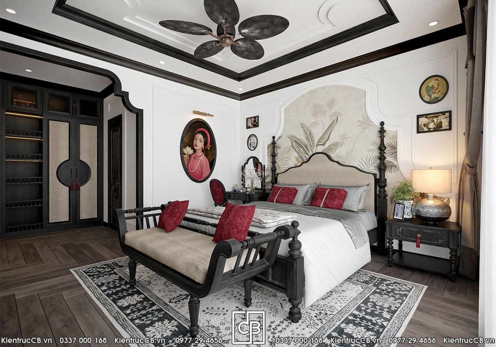 Chiếc giường tân cổ điển: Giường ngủ được thiết kế với đầu giường bọc nỉ uốn vòm, bao quanh bởi hệ phào chỉ cầu kỳ. Phía trên là quạt trần cánh gỗ hình lá độc đáo, vừa làm mát vừa là vật trang trí đầy tính nghệ thuật.