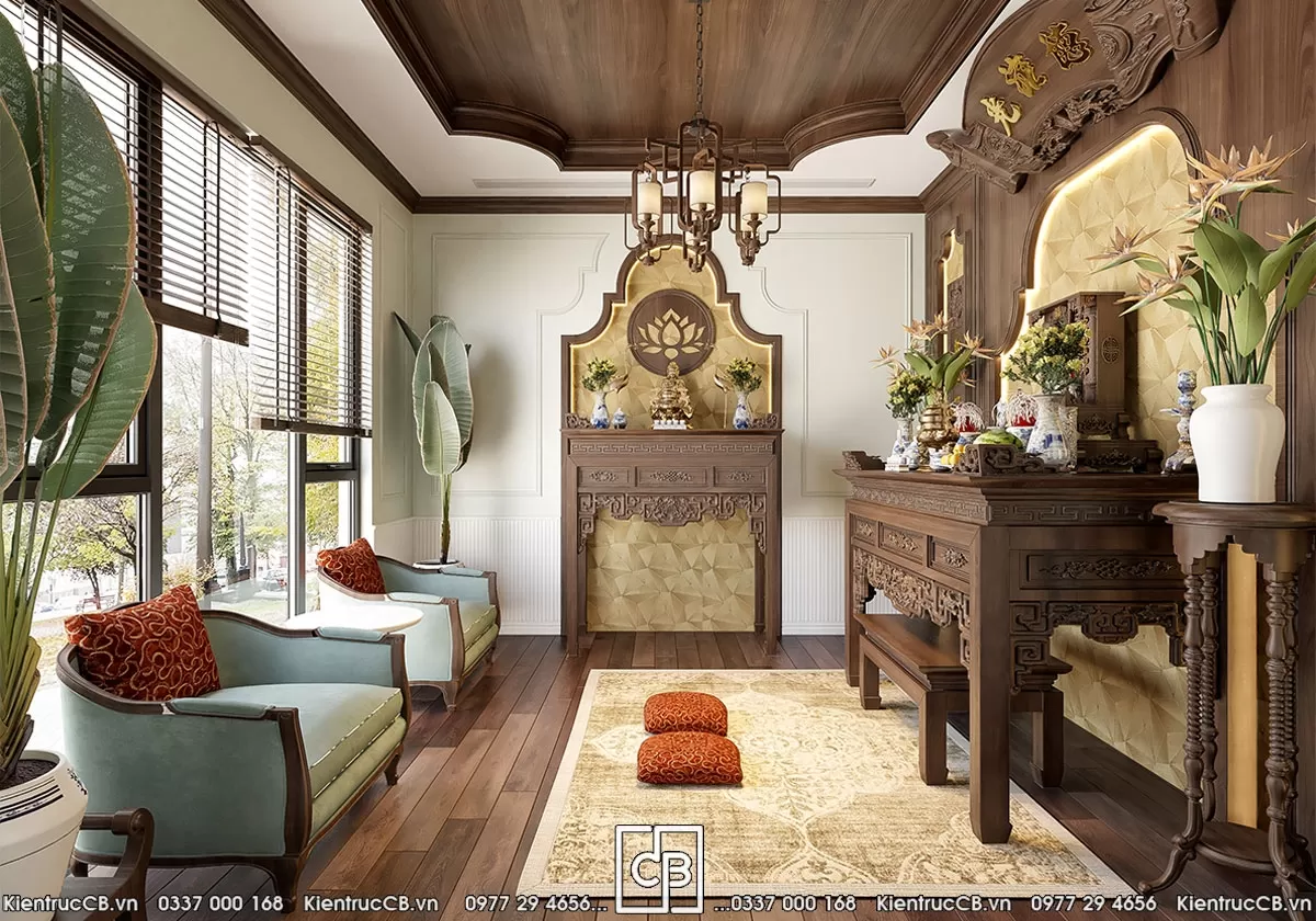 Phòng thờ là không gian đặc biệt quan trọng trong kiến trúc Indochine, thể hiện đạo hiếu, cội nguồn và sự kết nối giữa các thế hệ. Thiết kế phòng thờ đề cao tính đối xứng, tĩnh tại và chuẩn phong thủy.