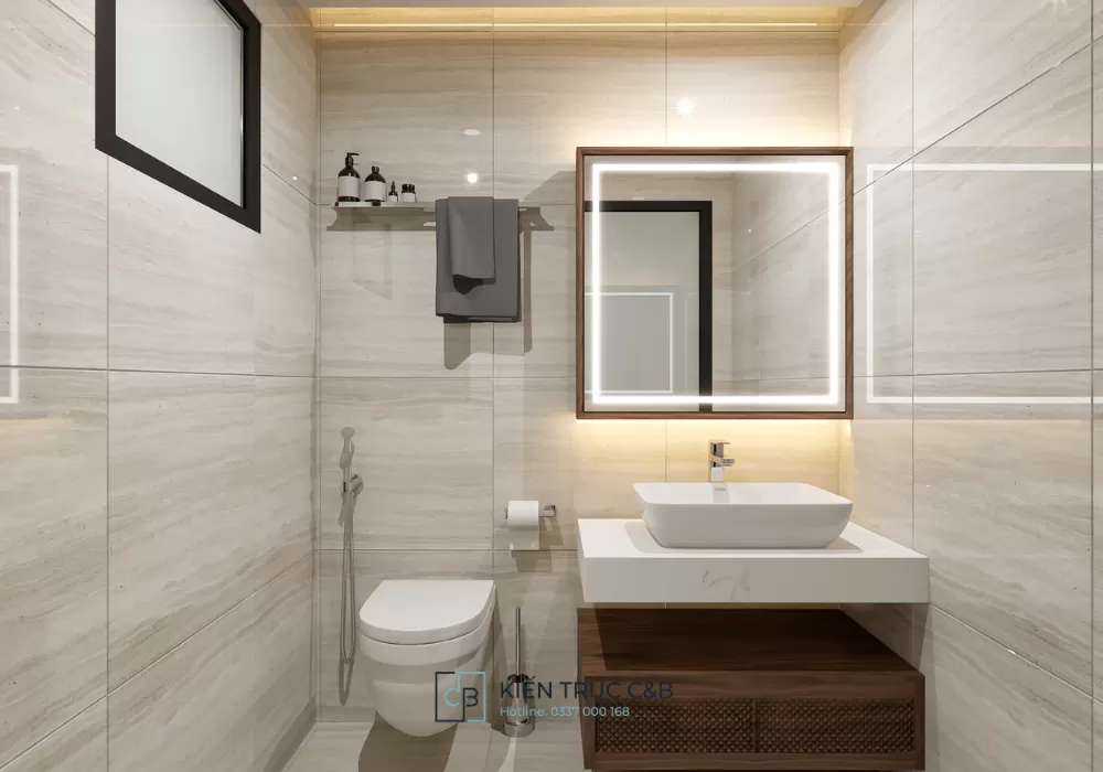 Phòng vệ sinh phong cách hiện đại thường có thiết kế tối giản, tinh tế và sử dụng vật liệu cao cấp để mang lại cảm giác sạch sẽ, sang trọng.
