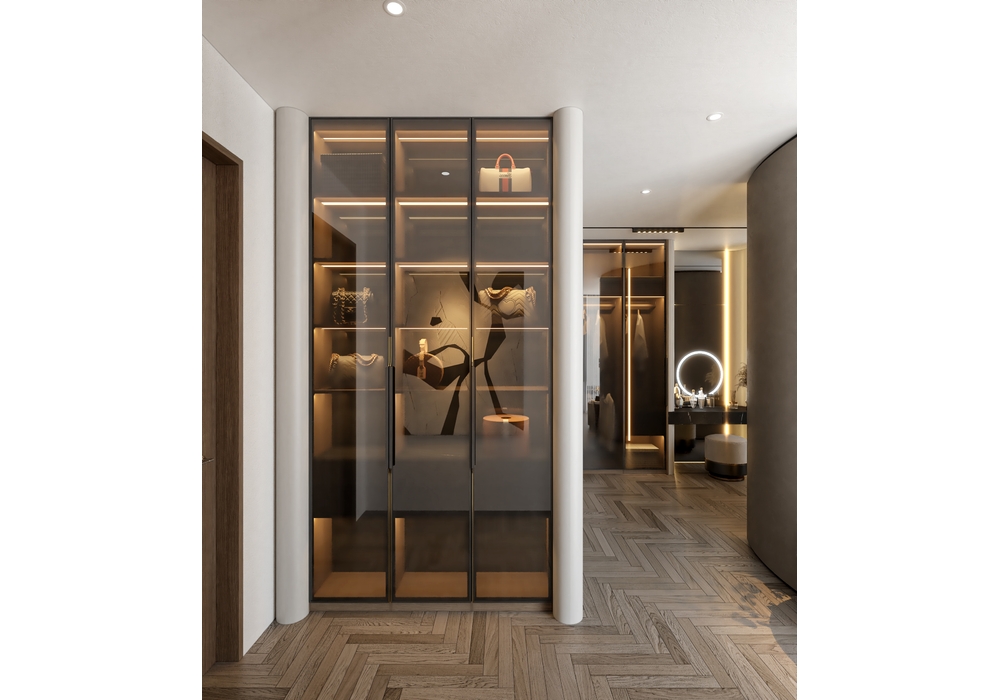 Lối đi giữa hai dãy tủ mang lại trải nghiệm như bước vào showroom cá nhân – vừa tiện nghi, vừa thể hiện gu thẩm mỹ của gia chủ.