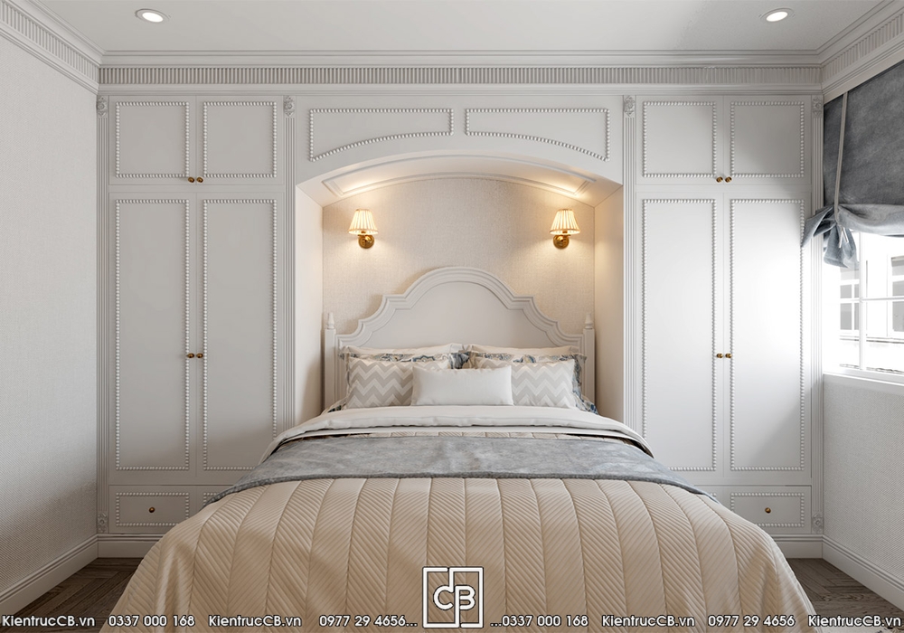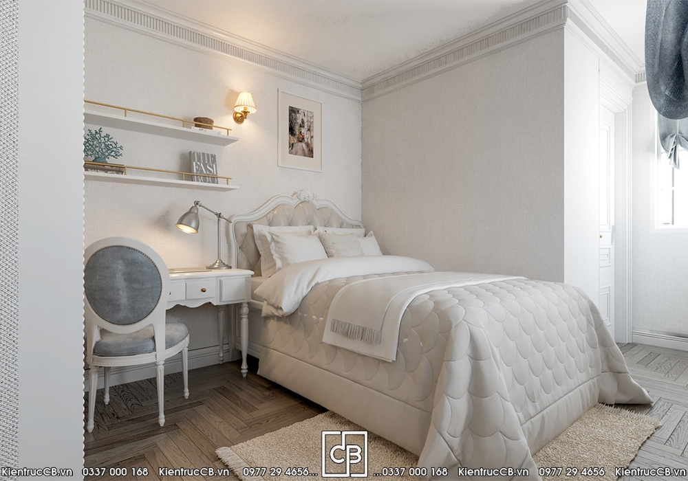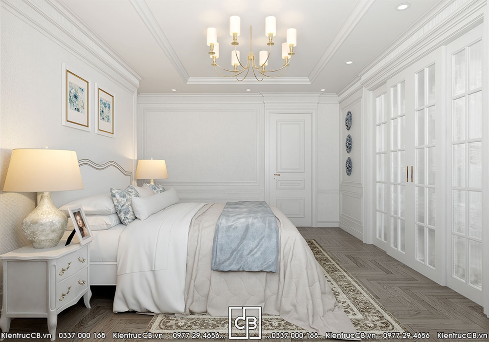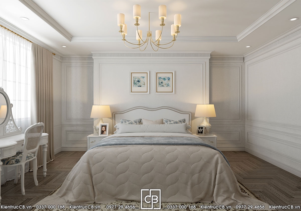 Phòng ngủ được thiết kế theo tinh thần tân cổ điển thanh lịch, ưu tiên sự thư giãn và cảm giác nghỉ ngơi trọn vẹn.