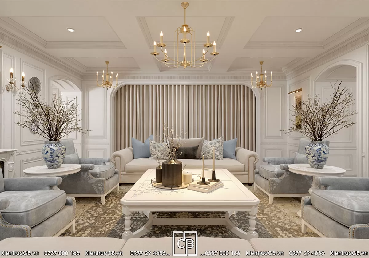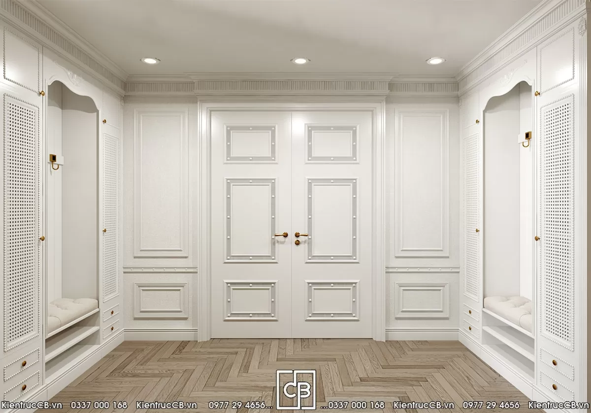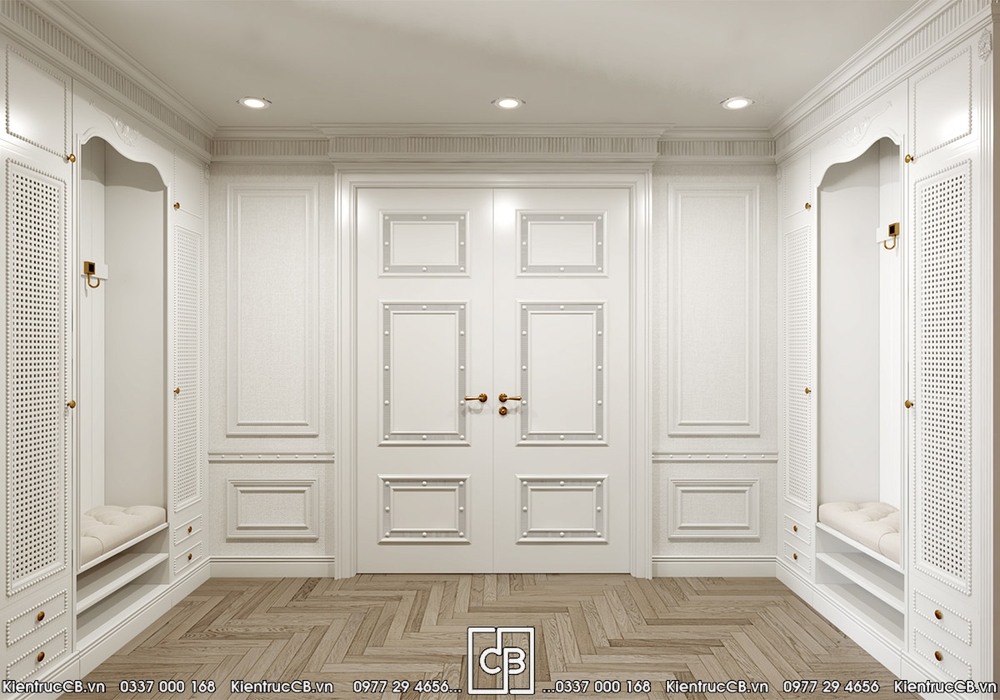 Không gian được tổ chức theo bố cục cân đối, mang tinh thần cổ điển chuẩn mực nhưng đã được làm mềm bằng những đường nét thanh thoát, hiện đại. Hệ phào chỉ mảnh, chạy đều trên tường và trần, không đóng vai trò trang trí đơn thuần mà trở thành yếu tố dẫn dắt cảm xúc, giúp không gian có chiều sâu mà vẫn nhẹ nhàng, thoáng đãng. Gam màu trắng – kem – xám nhạt được lựa chọn chủ đạo, kết hợp cùng ánh sáng vàng dịu, tạo nên cảm giác ấm áp, sang trọng mà không hề nặng nề.