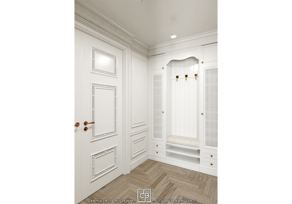 Như bước vào cửa nhà là hệ tủ giày đối xứng, rất tinh tế đệm ngồi lại đến chỗ treo áo khoác. Hay khu vực pha cà phê nhỏ gọn - xinh xắn góc cạnh bàn ăn. Tất cả đều được khéo léo mang phong cách thiết kế tân cổ điển nhẹ nhàng.