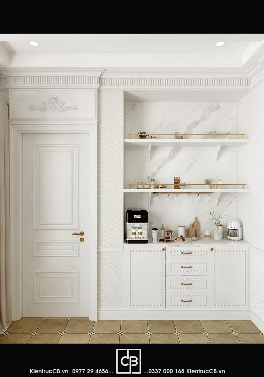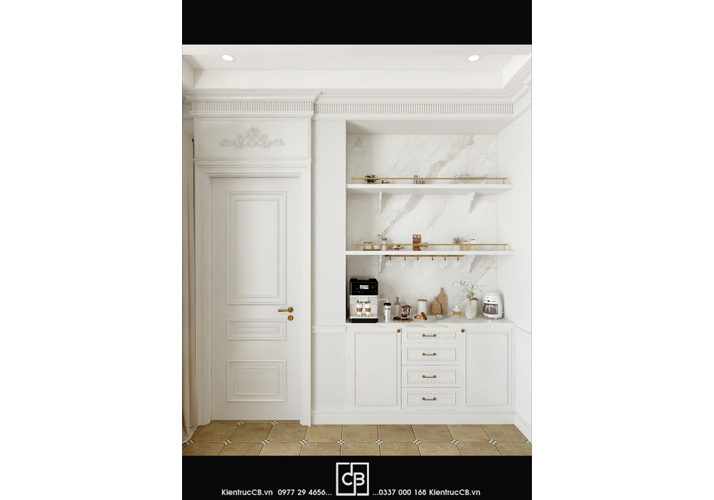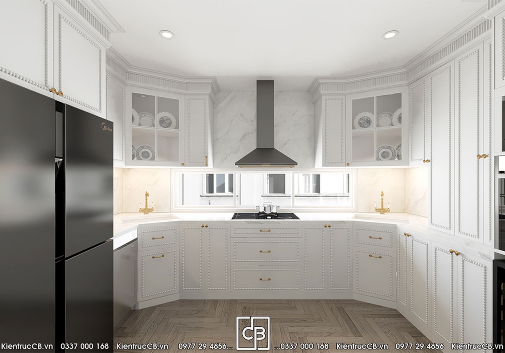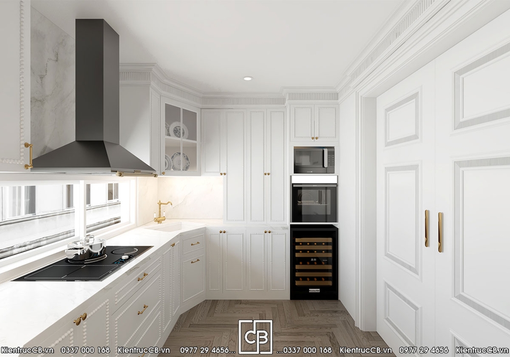 Điểm nổi bật của khu bếp chính là hệ tủ bếp tân cổ điển sơn trắng, được thiết kế với phào chỉ tinh tế và các đường bo mềm mại. Tay nắm kim loại mạ vàng nhẹ tạo điểm nhấn sang trọng, đồng thời tăng tính thẩm mỹ cho tổng thể không gian.