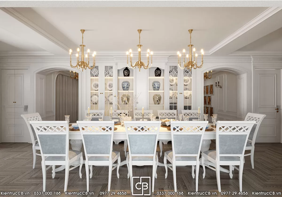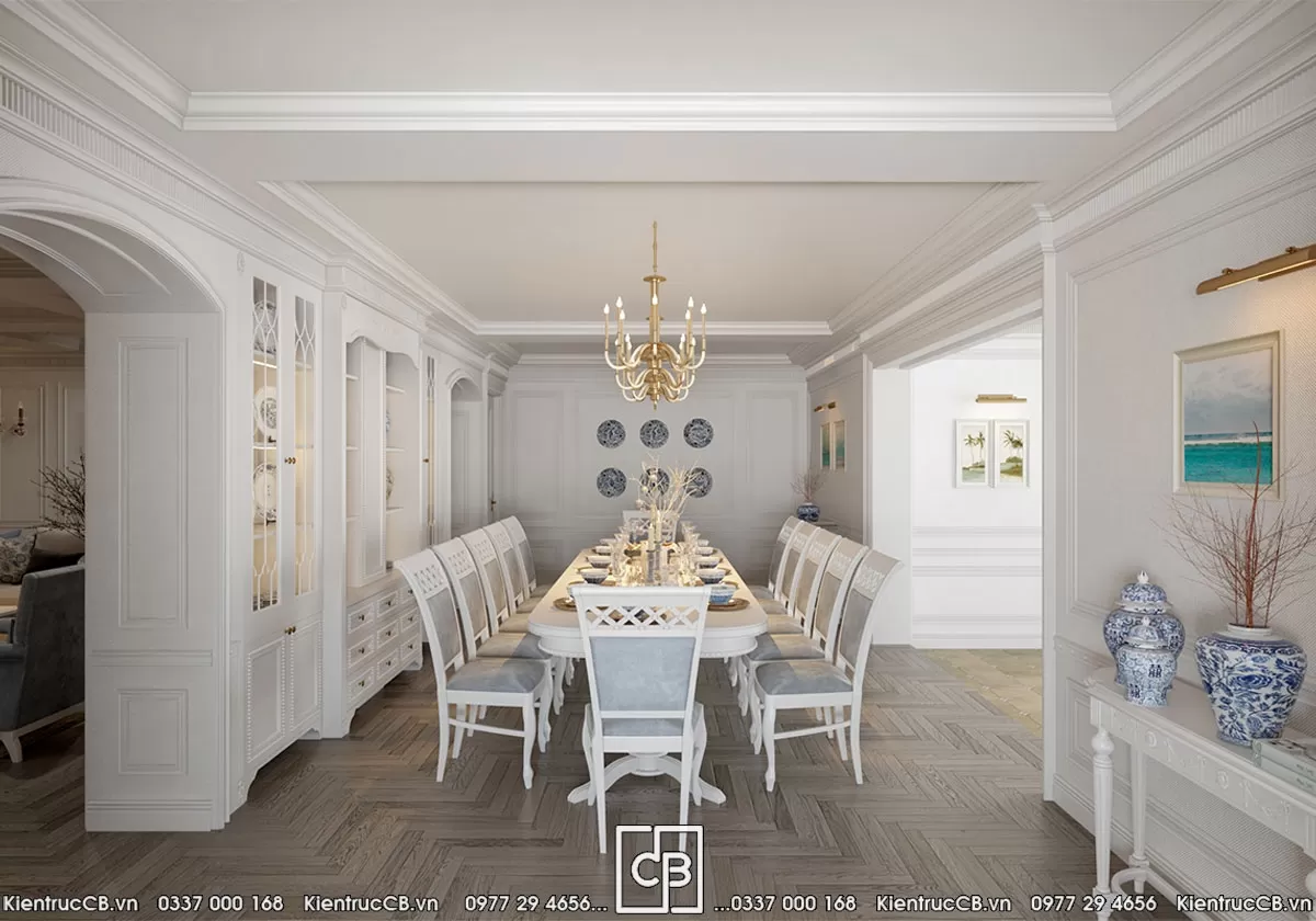 Phòng ăn mang đậm tinh thần tân cổ điển thanh lịch, nơi mỗi bữa ăn không chỉ là sinh hoạt thường nhật mà trở thành một nghi thức gắn kết gia đình.