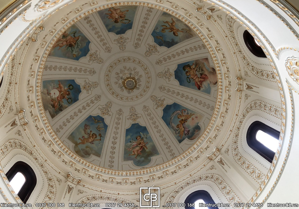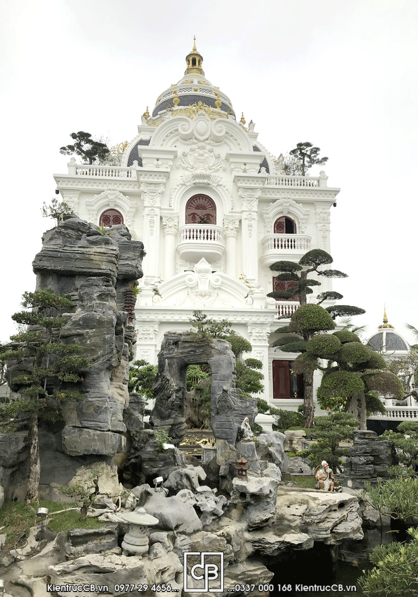 Tại mặt tiền của biệt thự, nổi bật là sự đối xứng mặt đứng của công trình tạo thẩm mĩ cao; đường join nhẹ nhàng, chi tiết đắp nổi, phù điêu, họa tiết phối hài hòa; Sự phá cách kết hợp kiểu chóp lâu đài nổi bật kết hợp tone trắng hoàng gia càng làm tăng thêm nét quyến rũ, đằm thắm của thiết kế lâu đài cổ châu Âu.