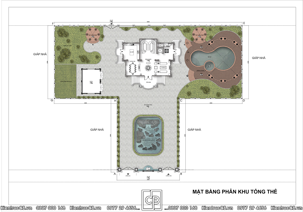 Khu vực chính: Biệt thự được đặt ở vị trí trung tâm, với sảnh đón sang trọng và lối đi rộng rãi, tạo cảm giác bề thế ngay từ cái nhìn đầu tiên.