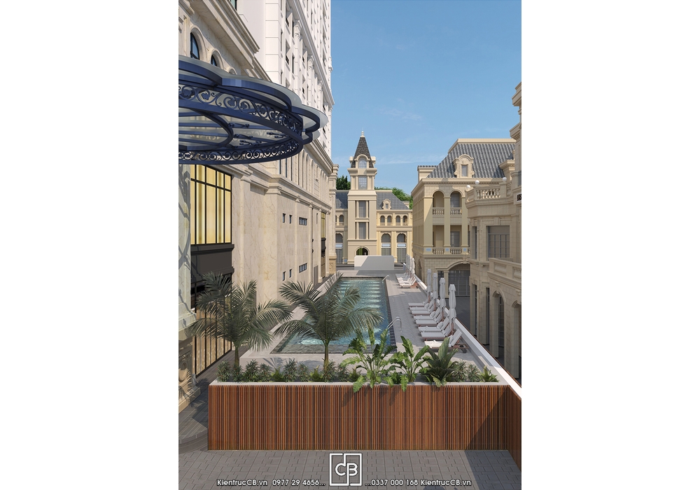 Trong các công trình thiết kế khách sạn tân cổ điển, hồ bơi không chỉ là tiện ích đi kèm mà còn là điểm nhấn khẳng định đẳng cấp. Hình ảnh hồ bơi ngoài trời với tầm nhìn thoáng đãng, bao quanh là khối kiến trúc sang trọng, mang đến không gian thư giãn lý tưởng cho du khách.