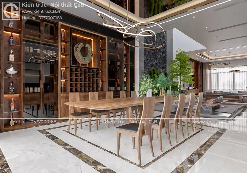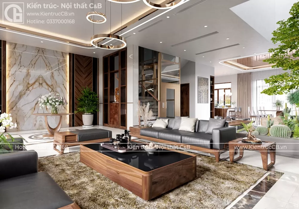 Phòng khách là trái tim của ngôi nhà, nơi cả gia đình quây quần sau những giờ làm việc căng thẳng. Với thiết kế nội thất gỗ óc chó, phòng khách trở nên sang trọng và ấm cúng hơn bao giờ hết. Bộ sofa gỗ óc chó với đường nét tinh tế, kết hợp cùng chiếc bàn trà mặt đá tự nhiên tạo nên một không gian tiếp khách hoàn hảo. Hệ thống đèn chiếu sáng gián tiếp giúp tôn lên vẻ đẹp của gỗ óc chó, mang đến không gian thư giãn tuyệt vời.
