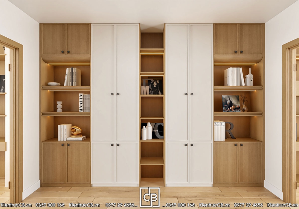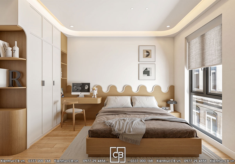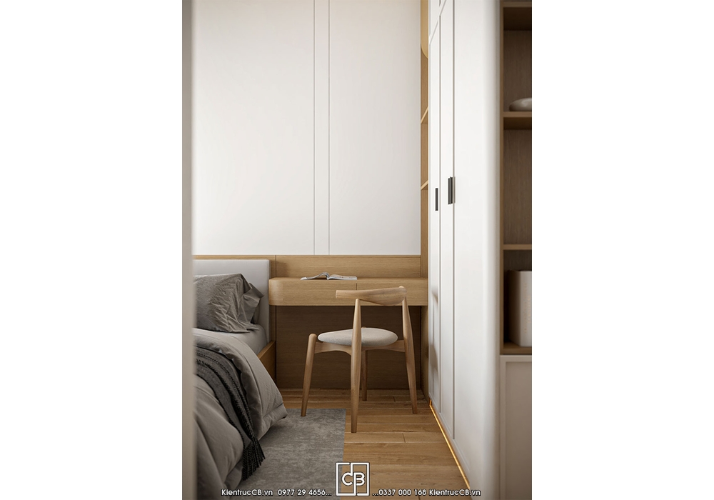 Tích hợp tủ và bàn: Hệ tủ quần áo được thiết kế liền khối với bàn học và kệ sách, tận dụng triệt để chiều cao của bức tường.