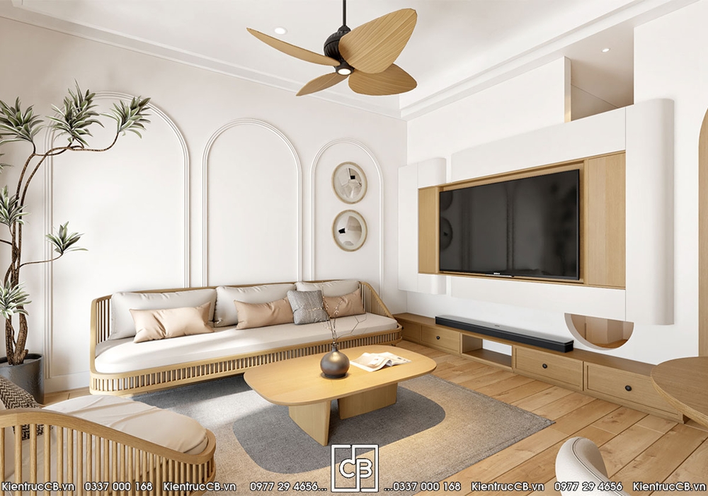 Sofa dáng thấp, khung gỗ tự nhiên kết hợp đệm vải sáng màu tạo cảm giác gần gũi. Bàn trà gỗ bo tròn mềm mại giúp không gian trở nên thân thiện hơn, đồng thời hạn chế các góc cạnh cứng nhắc thường thấy trong thiết kế hiện đại.