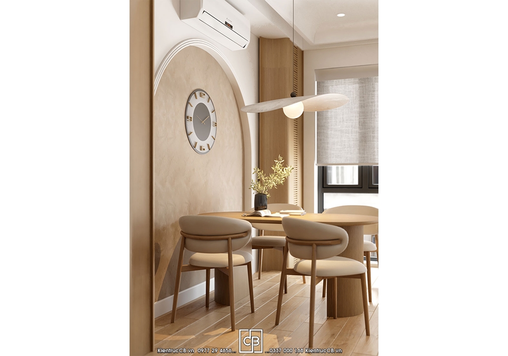 Vòm tường bo cong phía sau bàn ăn là một điểm nhấn rất “Japandi” – mềm mại, nhẹ nhàng nhưng đủ để tạo chiều sâu thẩm mỹ cho toàn bộ không gian.