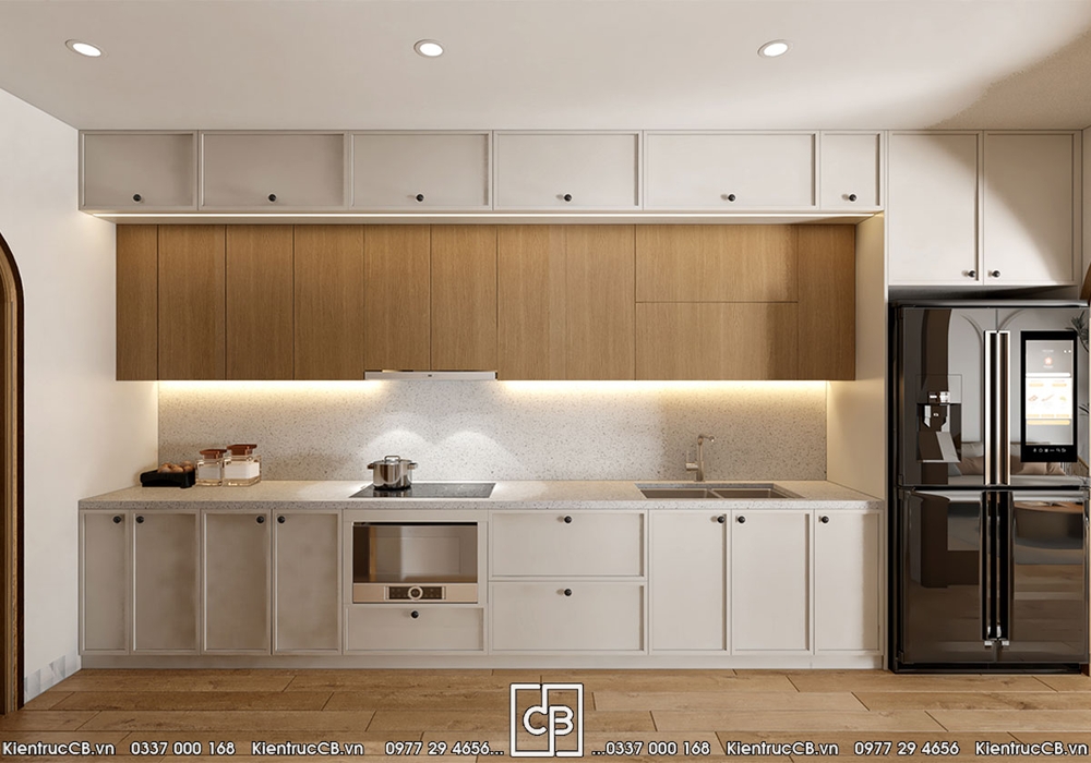 Tủ bếp kịch trần: Sử dụng cánh tủ phẳng (Flat panel) màu trắng phía trên và màu gỗ phía dưới giúp gian bếp trông cao hơn và không bị nặng nề.