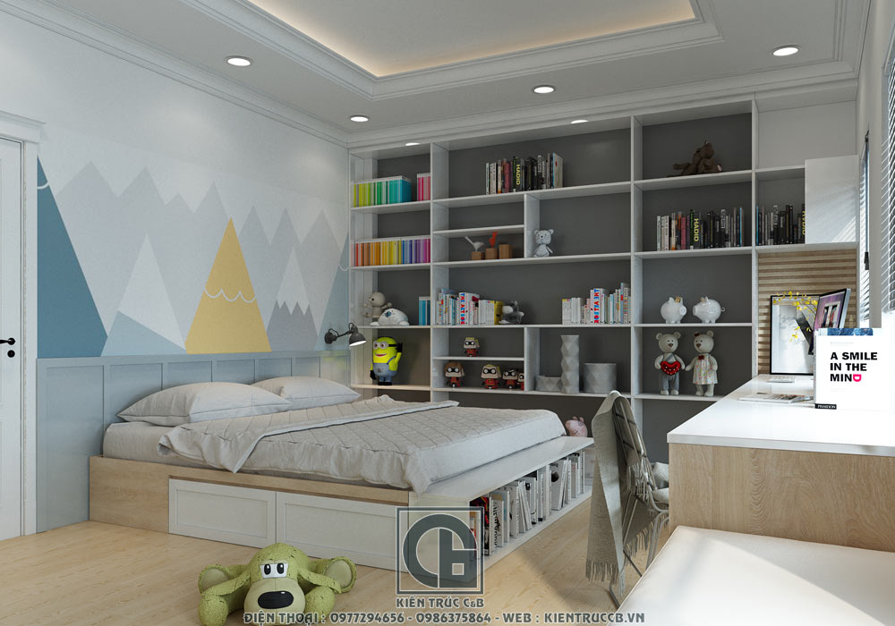 Hệ tủ sách cũng được thiết kế năng động, hiện đại để chủ nhân của căn phòng trang trí cũng như để sách vở.