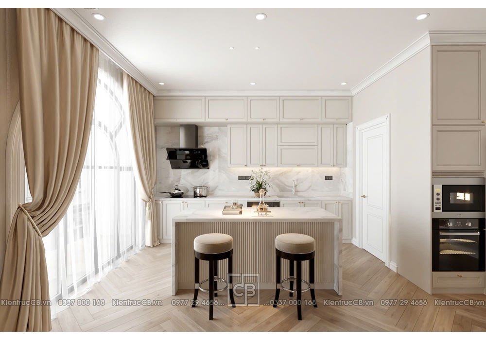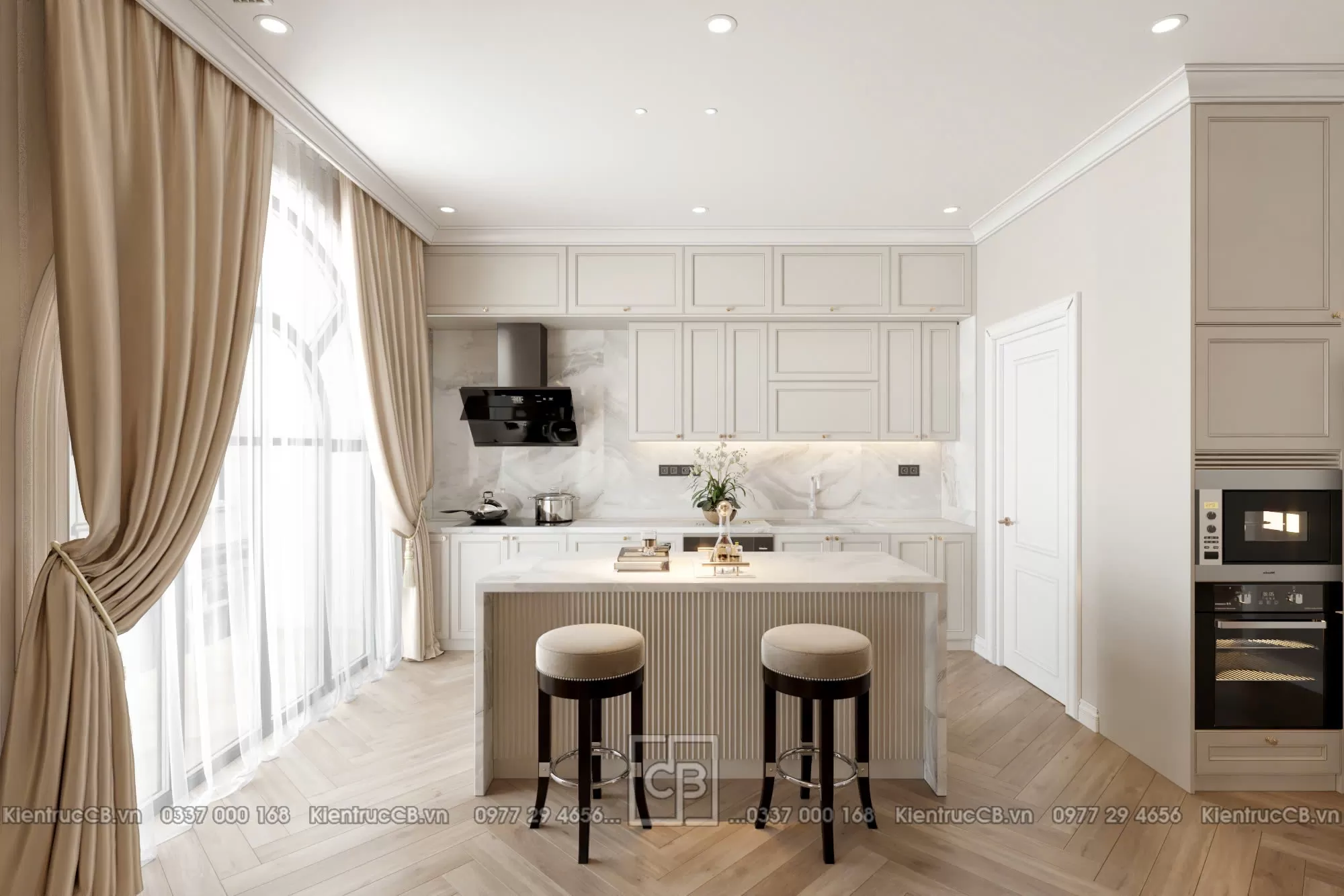 Khu bếp được bố trí gọn gàng phía sau, đảm bảo sự riêng tư nhưng vẫn liên kết mạch lạc với không gian chung. Hệ tủ bếp thiết kế âm tường với gam màu sáng, kết hợp mặt đá cao cấp giúp tăng độ bền và tính thẩm mỹ.