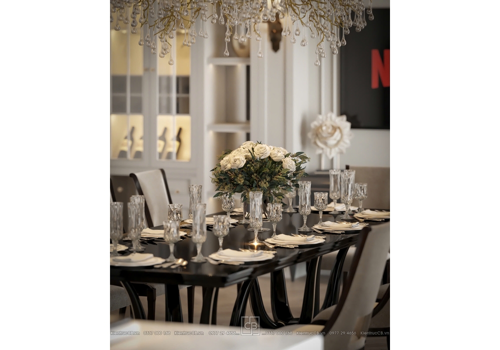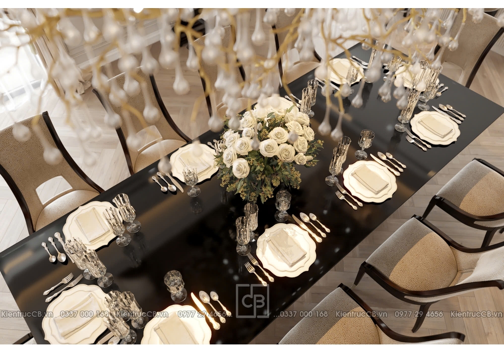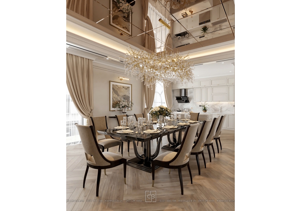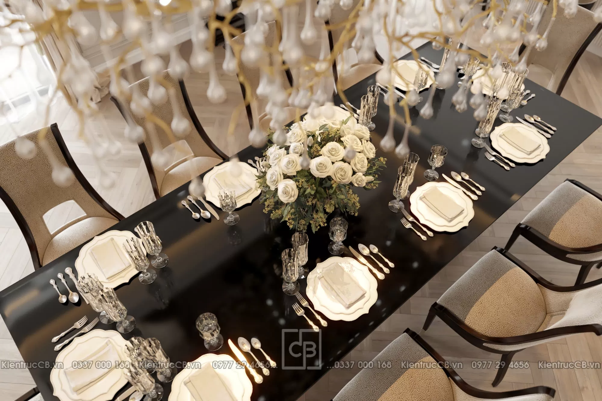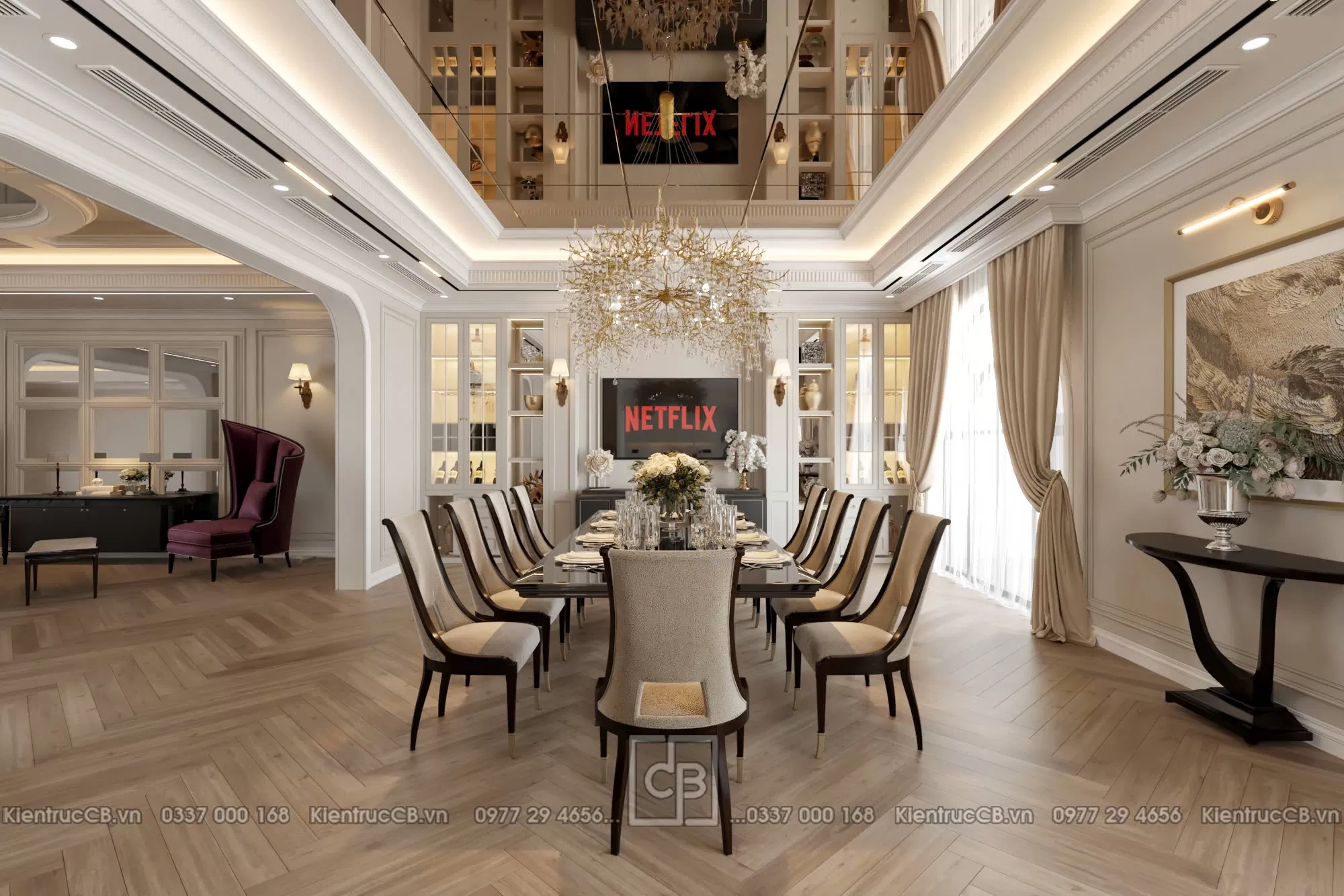 Không gian phòng ăn là điểm nhấn ấn tượng với bàn ăn dài, bố trí nhiều chỗ ngồi phù hợp cho những buổi tiệc gia đình hoặc tiếp khách. Ghế ăn bọc nệm cao cấp, thiết kế thanh lịch, mang lại cảm giác thoải mái khi sử dụng.