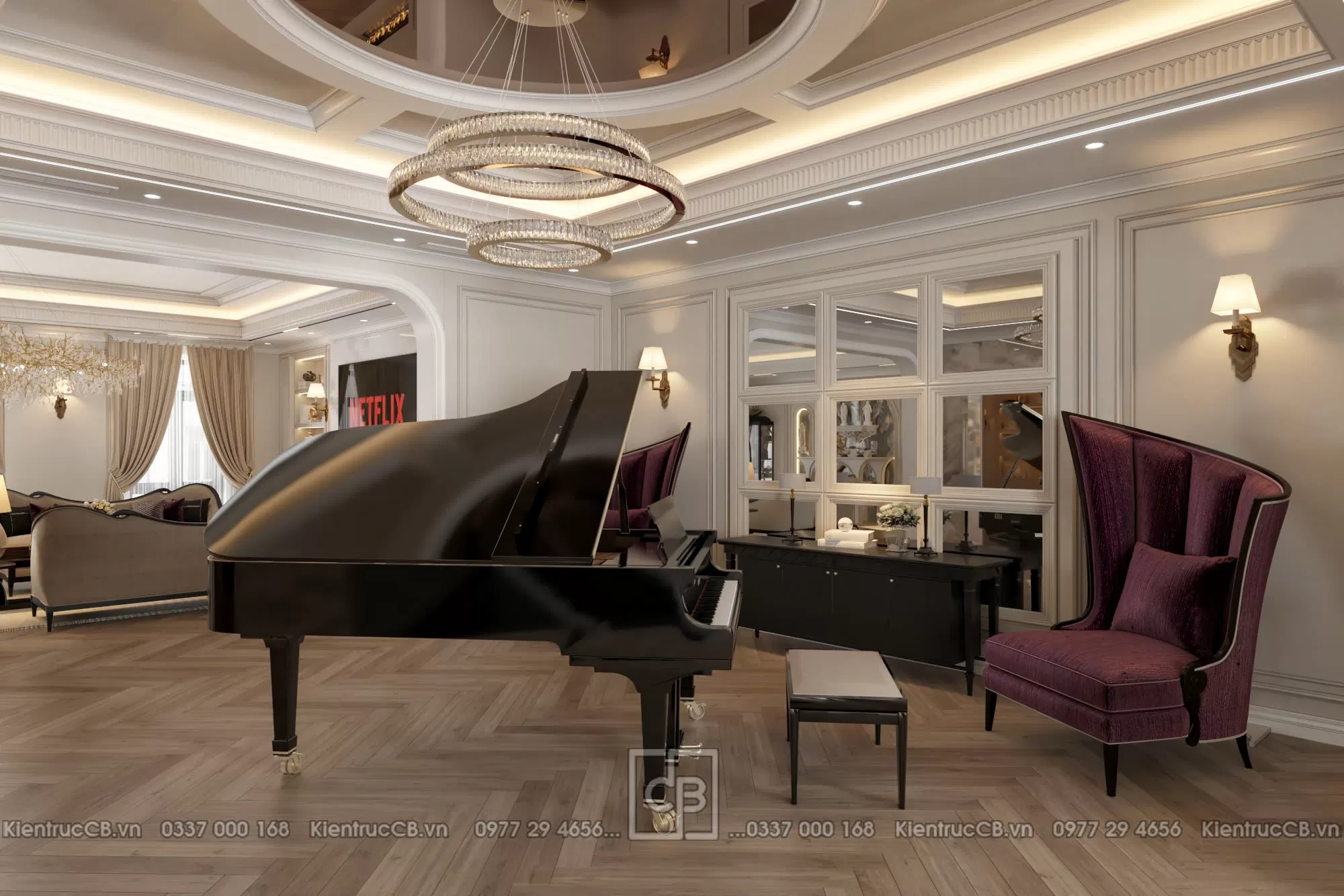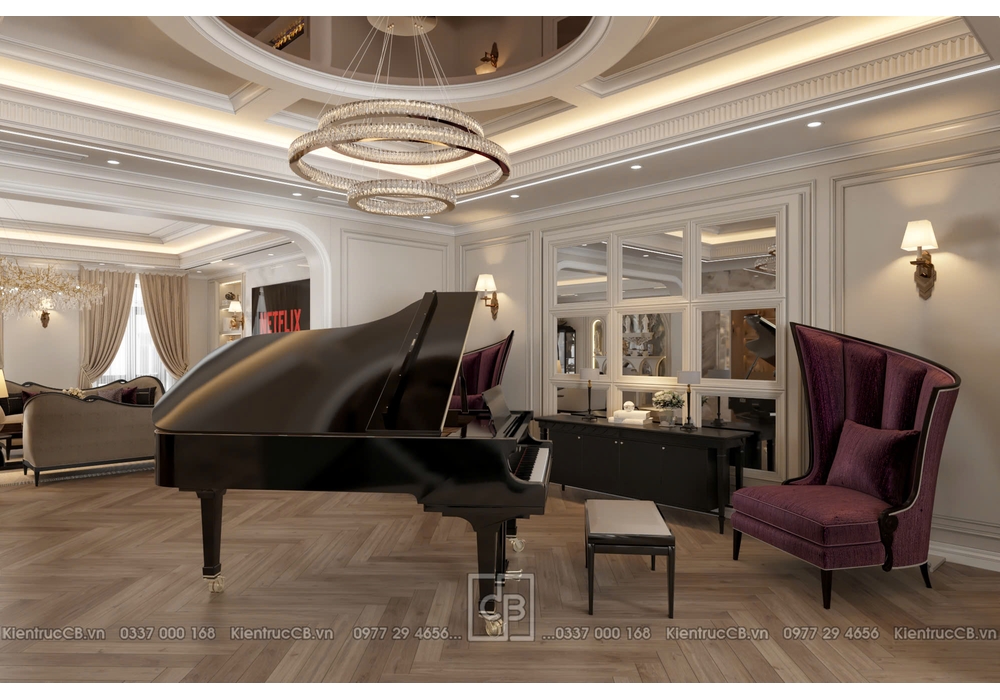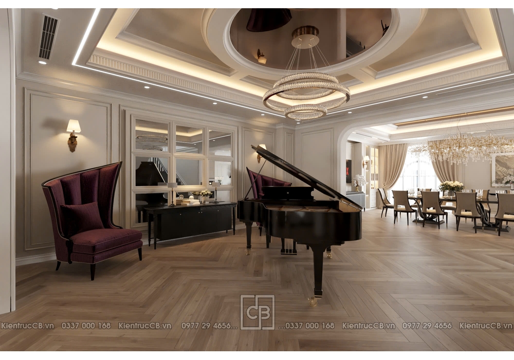 Sàn gỗ xương cá cao cấp cùng hệ tường phào chỉ tinh xảo mang lại cảm giác sang trọng, chỉn chu. Không gian được bố trí thêm điểm nhấn như ghế thư giãn, đàn piano hoặc bàn console trang trí, vừa tăng tính thẩm mỹ vừa thể hiện gu sống tinh tế của gia chủ.