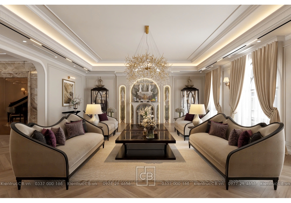 Phòng khách được thiết kế theo bố cục đối xứng đặc trưng của phong cách tân cổ điển, mang lại cảm giác cân bằng và bề thế. Bộ sofa bọc nỉ cao cấp với đường cong mềm mại kết hợp bàn trà trung tâm tạo nên điểm nhấn tinh tế.