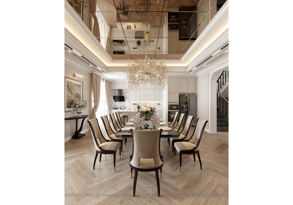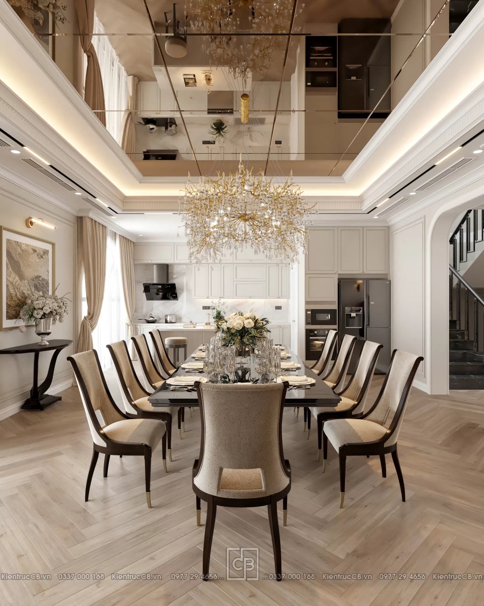 Điểm đặc biệt là hệ trần gương kết hợp đèn chùm pha lê nghệ thuật, giúp nhân đôi hiệu ứng ánh sáng và mở rộng không gian. Tất cả tạo nên một khu vực dùng bữa sang trọng, ấm cúng, đậm chất “fine dining” ngay trong chính ngôi nhà.