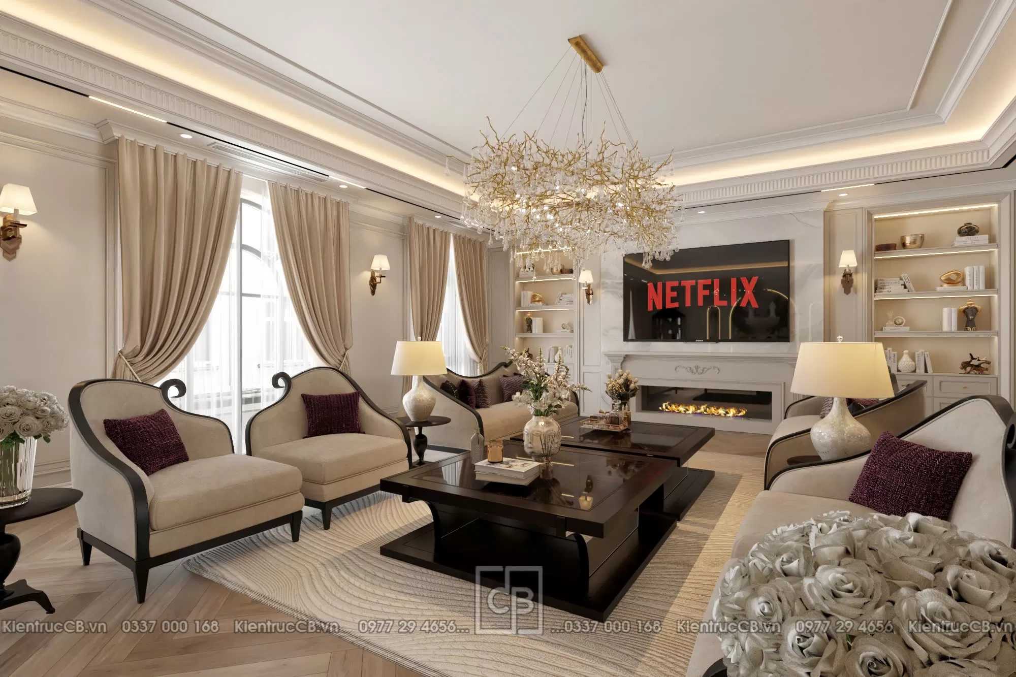 Mảng tường chính được xử lý với phào chỉ và hệ kệ âm tường trang trí, kết hợp ánh sáng gián tiếp giúp không gian thêm chiều sâu. Đặc biệt, khu vực lò sưởi mang hơi hướng châu Âu cổ điển, tạo cảm giác ấm cúng nhưng vẫn rất đẳng cấp. Tổng thể phòng khách toát lên vẻ đẹp nhẹ nhàng, thanh lịch nhưng không kém phần quyền uy.