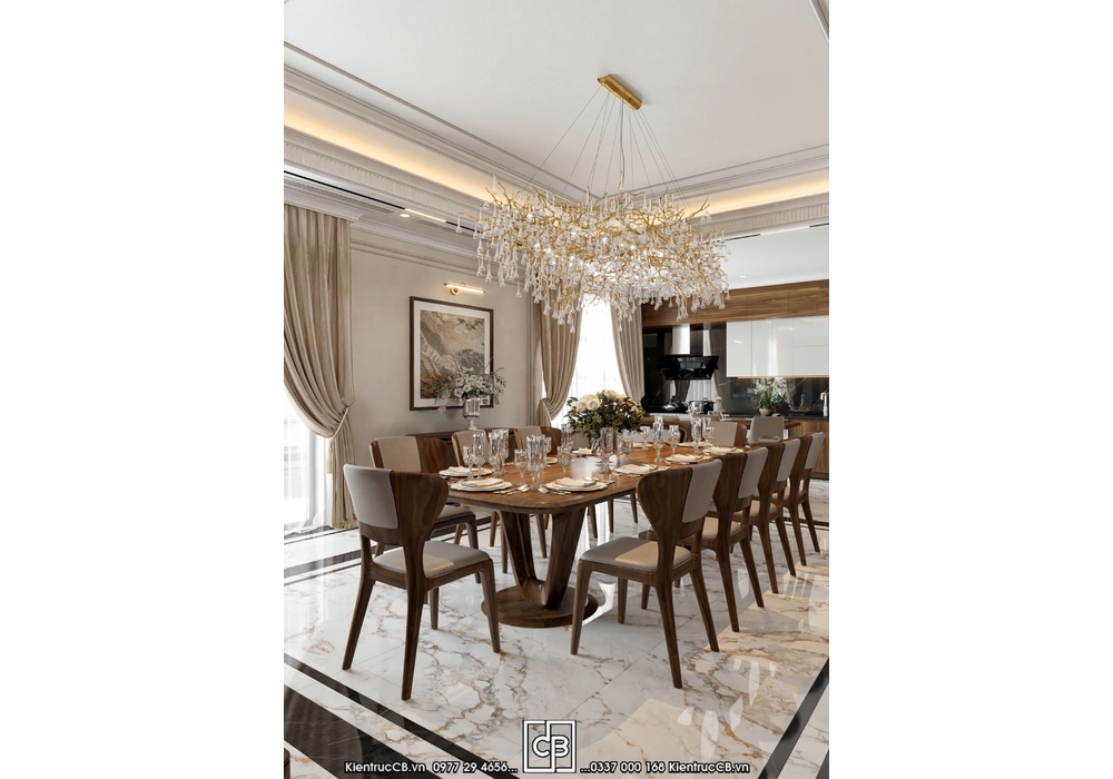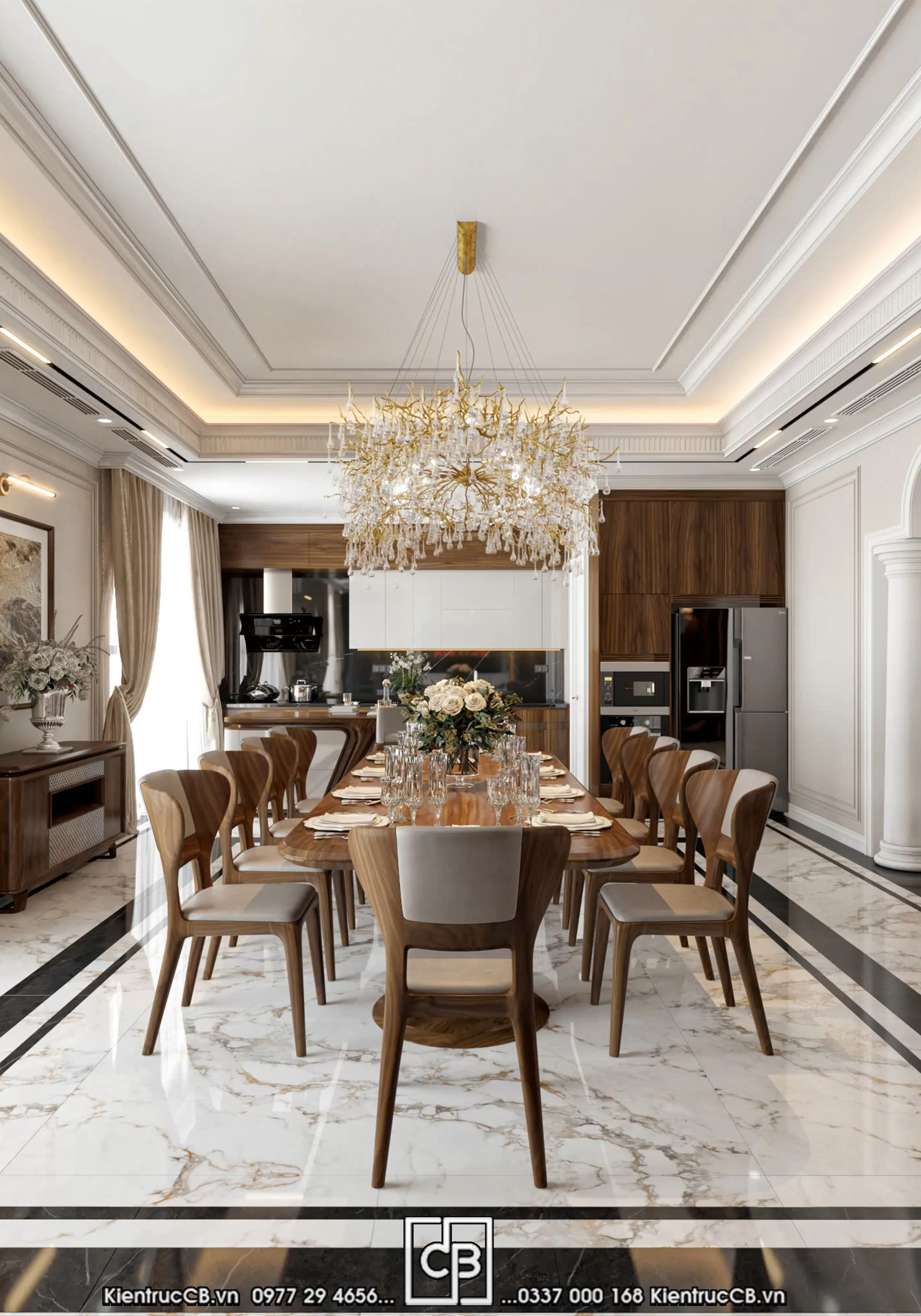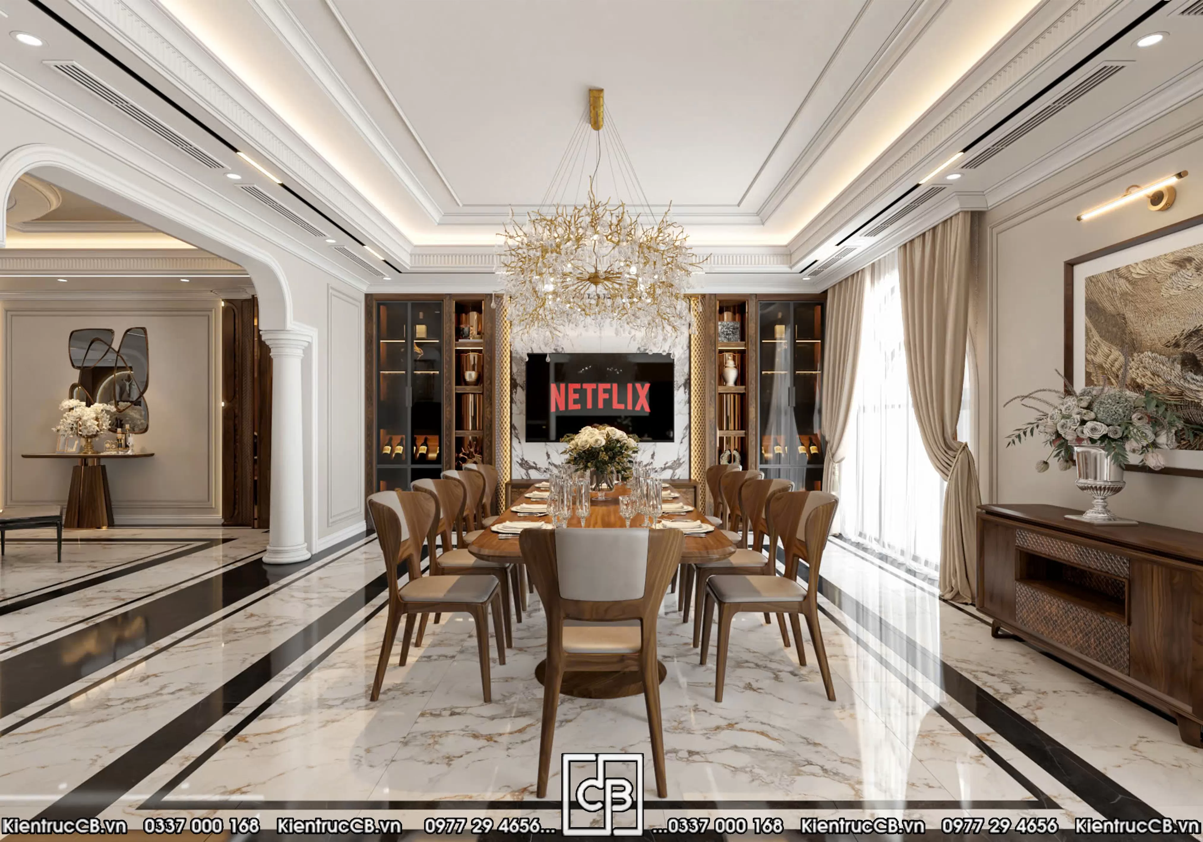 Phòng ăn gây ấn tượng mạnh với bố cục đối xứng đặc trưng của Tân cổ điển.