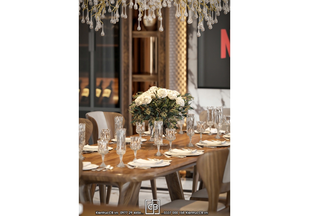 Hệ tủ trưng bày âm tường cùng ánh đèn hắt nhẹ mang lại cảm giác ấm áp nhưng vẫn đầy đẳng cấp. Tổng thể không gian vừa sang trọng, vừa gần gũi – lý tưởng cho những bữa tiệc gia đình ấm cúng.