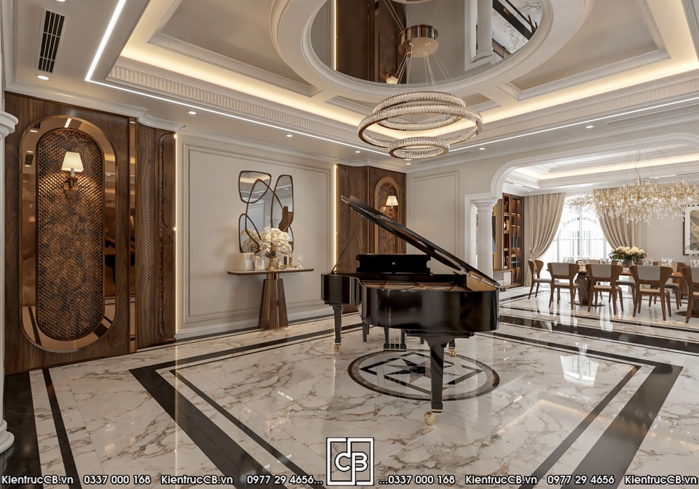 Ngay từ khu vực sảnh chính, thiết kế đã gây ấn tượng mạnh với trần cao kết hợp đèn chùm pha lê hiện đại, tạo điểm nhấn nổi bật cho toàn bộ không gian. Sàn đá marble cao cấp với các đường viền hoa văn tinh xảo giúp tăng thêm cảm giác sang trọng và bề thế.
