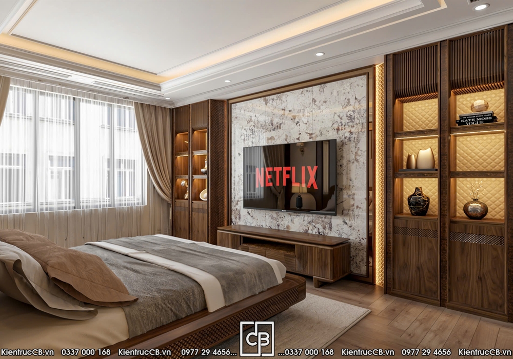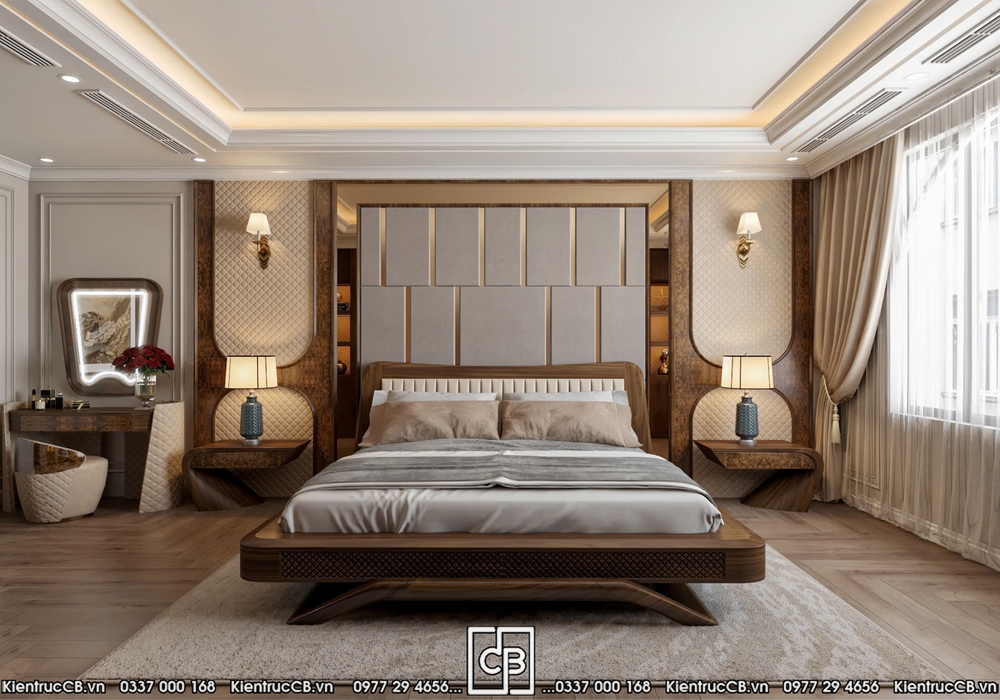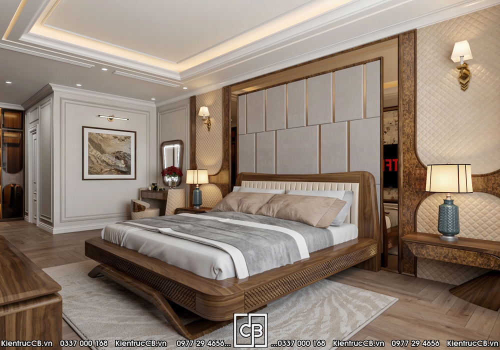 Phòng ngủ Master không chỉ là nơi nghỉ ngơi mà còn là không gian thể hiện đẳng cấp sống của gia chủ. Với thiết kế tân cổ điển sang trọng, căn phòng mang đến sự hài hòa giữa vẻ đẹp tinh tế và tiện nghi hiện đại. Từng chi tiết nội thất được chăm chút tỉ mỉ, từ giường ngủ, hệ tủ trang trí cho đến khu vực tủ quần áo, tạo