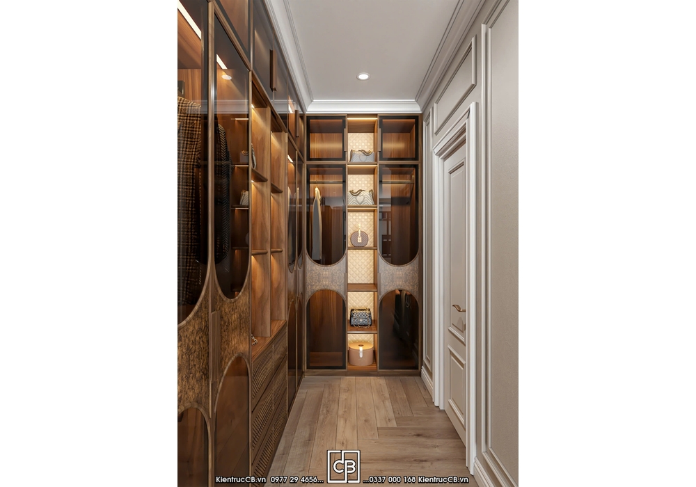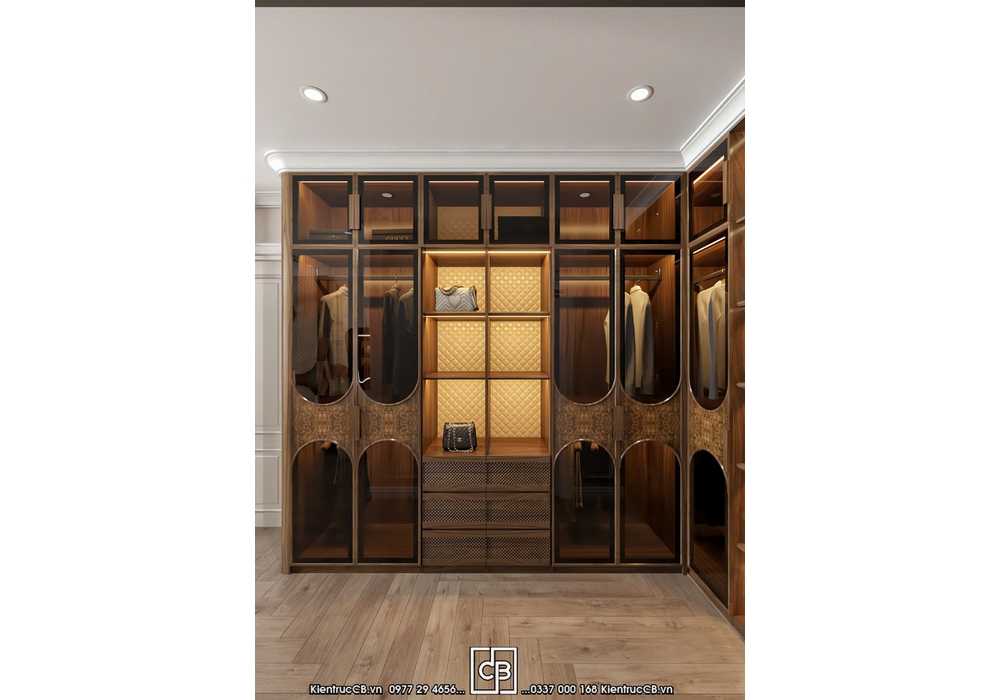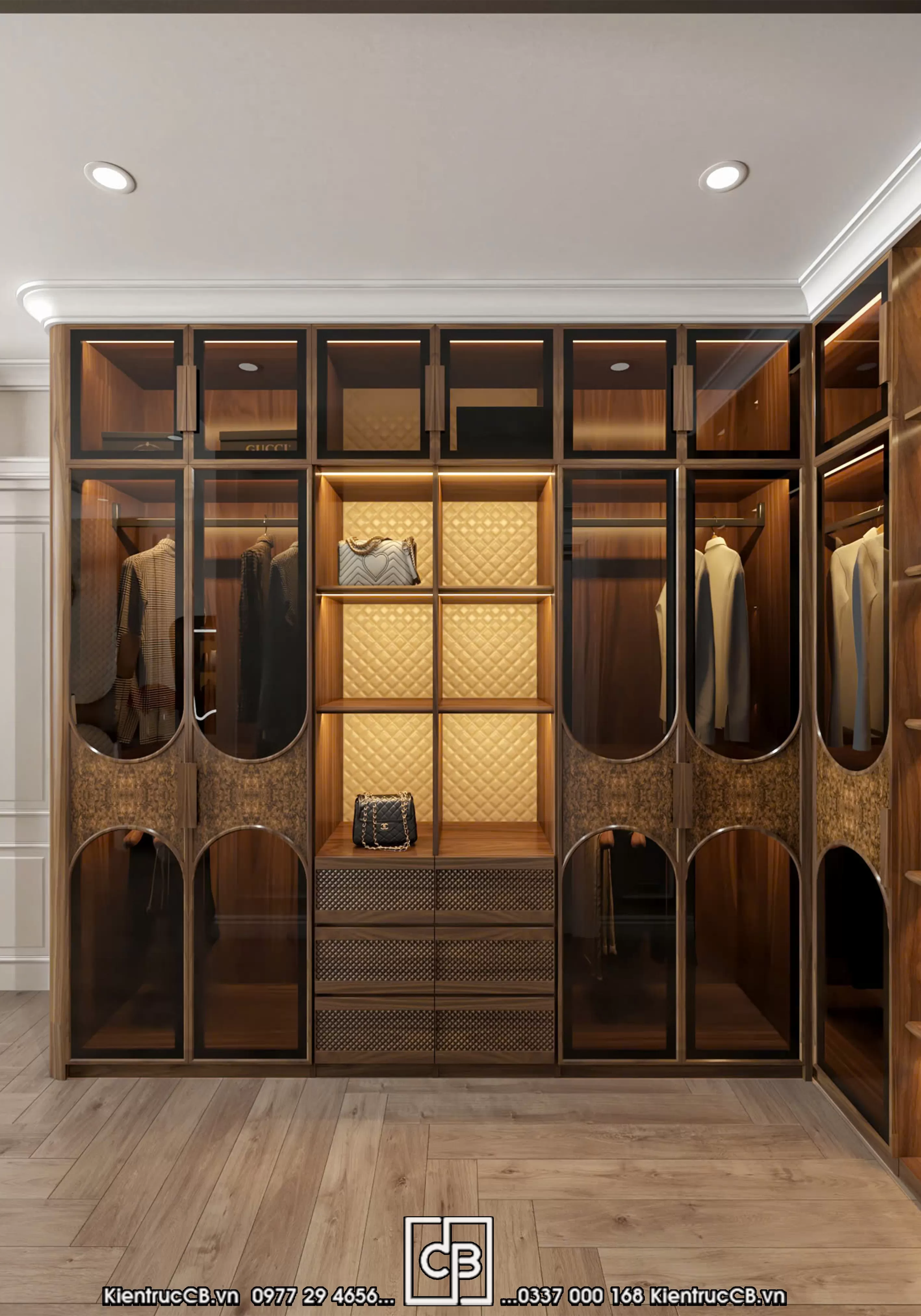 Hệ đèn led âm bên trong tủ không chỉ tạo điểm nhấn thẩm mỹ mà còn giúp gia chủ dễ dàng sử dụng và sắp xếp trang phục.