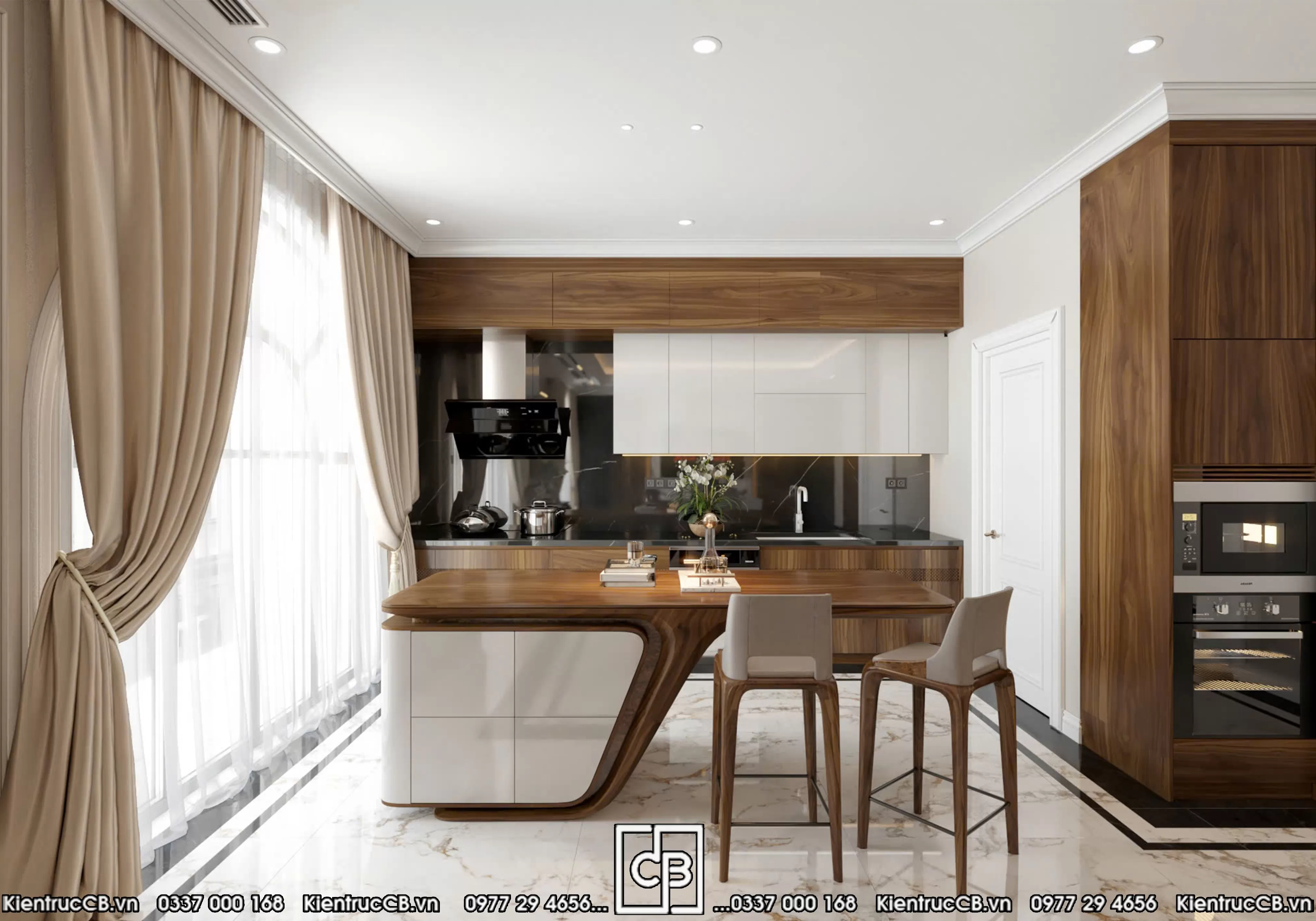Sự kết hợp giữa vật liệu gỗ ấm áp và bề mặt đá sáng bóng tạo nên sự cân bằng hoàn hảo giữa sang trọng và thực tế sử dụng.