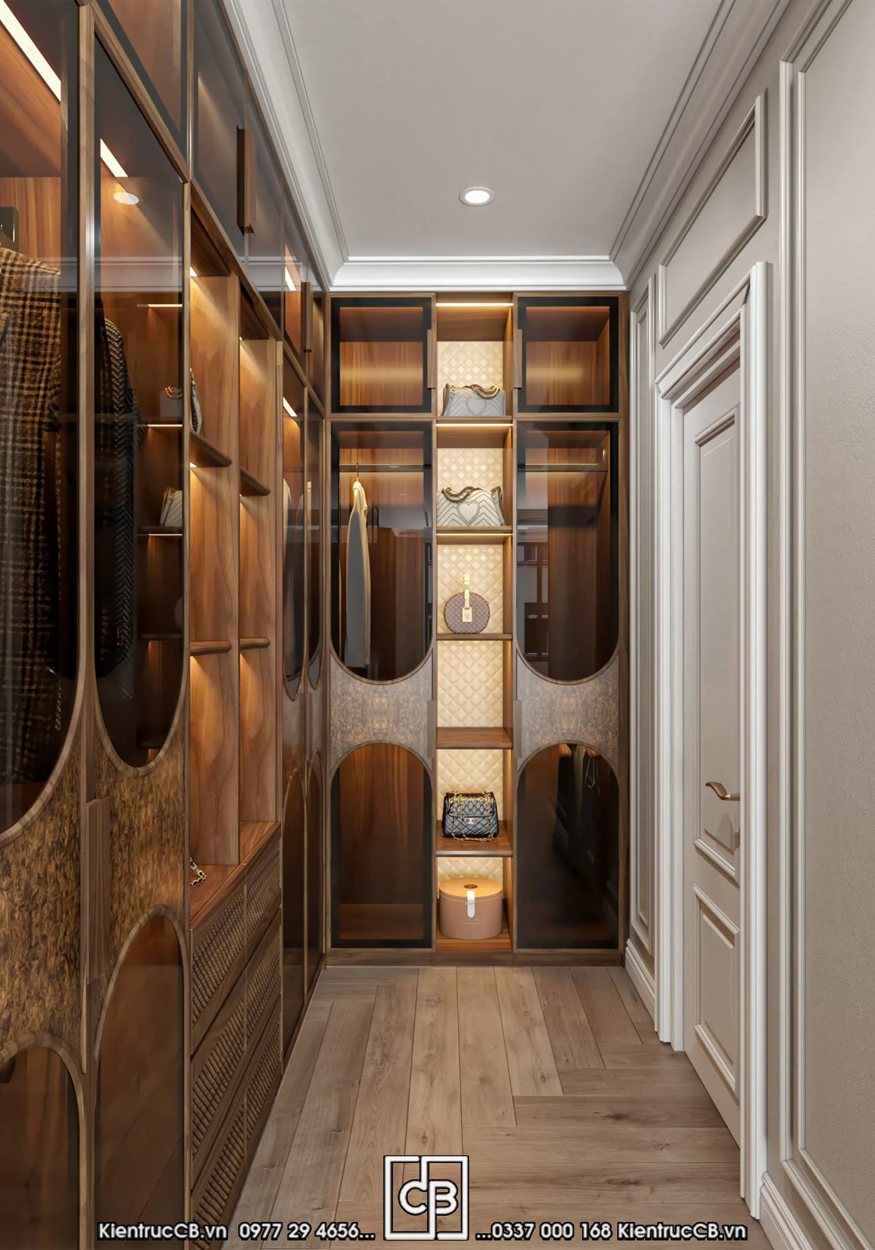 Không gian phòng Master được bố trí hệ tủ quần áo kịch trần với thiết kế cửa kính kết hợp khung gỗ sang trọng. Bên trong tủ được chia ngăn khoa học giúp tối ưu khả năng lưu trữ.